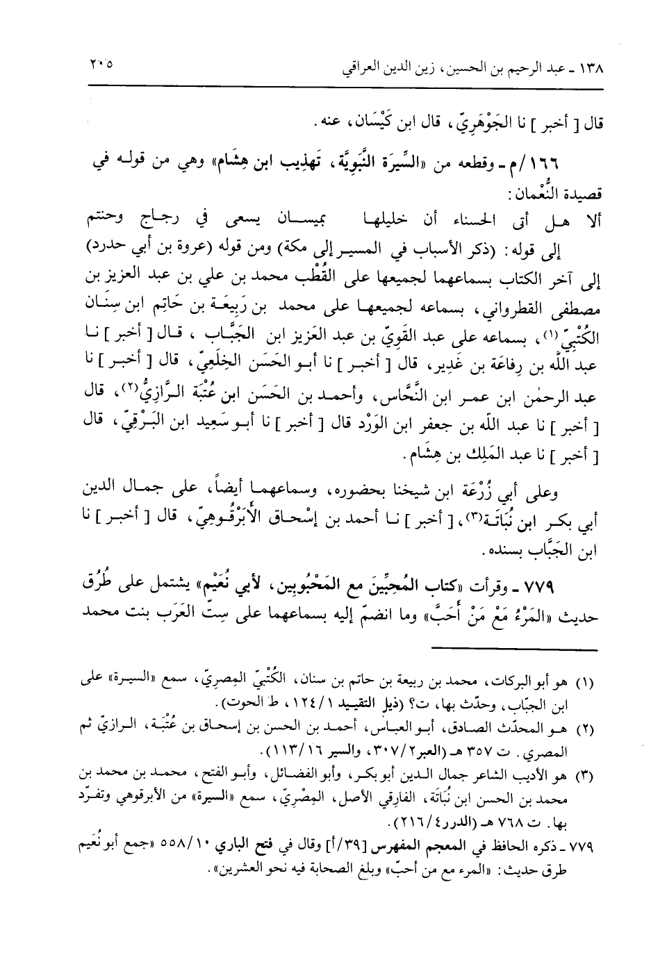 إلى قوله: (ذكر الأسباب فى المسير إلى مكة) ومن قوله (عروة بن أبي حدرد) إلى آخر الكتاب بسماعهما لجميعها على القطب محمد بن علي بن عبد العزيز بن مصطفى القطرواني بسماعه لجميعها على محمد بن ربيعة بن حاتم ابن سنان الكُتبي بسماعه على عبد الثوي بن عبد العزيز ان الجباب قال [أخبر] نا عبد الله بن رفاعة بن غدير قال [أخبر] نا أبو الحسن الخلعي قال [أخبر] نا عبد الرحمن ابن عمر ابن النحاس وأحمد بن الحسن ابن عُتبة الرازي قال [أخبر] نا عبد الله بن جعفر ابن الورد قال [أخبر] نا أبو سعيد ابن البرقي قال [أخبر] نا عبد الملك بن هشام. وعلى أبي زرعة ابن شيخنا بحضوره وسمعاهما أيضاً على جمال الدين أبي بكر ابن نُباتة [أخبر] نا أحمد بن إسحاق الأبرقوهي قال [أخبر] نا ابن الجباب بسنده. 779 - وقرأت "كتاب المحبين مع المحبوبين لأبي نُعيم" يشتمل على طُرق حديث المرء مع من أحب وما انضم إليه بسماعهما على ست العرب بنت محمد