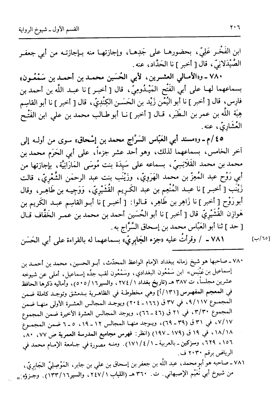 ابن الفخر علي بحضورها على جدها وإجازتها منه بإجازته من أبي جعفر الصيدلاني قال [أخبر] نا الحداد عنه. 780 - و"الأمالي العشرين لأبي الحسين محمد بن أحمد بن سمعون" بسماعهما لها على أبي الفتح الميدومي قال [أخبر] نا عبد الله بن أحمد بن فارس قال [أخبر] نا أبو اليمن زيد بن الحسن الكندي قال [أخبر] نا أبو القاسم هبة الله بن عمر بن الطبر قال [أخبر] نا أبو طالب محمد بن علي ابن الفتح العُشاري عنه. 45/م- و"مسند أبي العباس السراج محمد بن إسحاق" سوى من أوله إلى آخر الخامس بسماعهما لذلك وهو أحد عشر جزءاً على أبي الحرم محمد بن محمد بن محمد القلانسي بسماعه على سيدة بنت موسى المارانية بإجازتها من أبي روح عبد المُعز بن محمد الهروي وزينب بنت عبد الرحمن الشعري قالت زينب [أخبر] نا عبد المنعم بن عبد الكريم القُشيري ووجيه بن طاهر وقال أبو روح [أخبر] نا زاهر بن طاهر أبو الحسين أحمد بن محمد بن عمر الخفاف قال [حد] ثنا أبو العباس محمد بن إسحاق السراج به. 781 - وقرات عليه "جزء الجابري" بسماعهما له بالقراءة على أبي الحسن