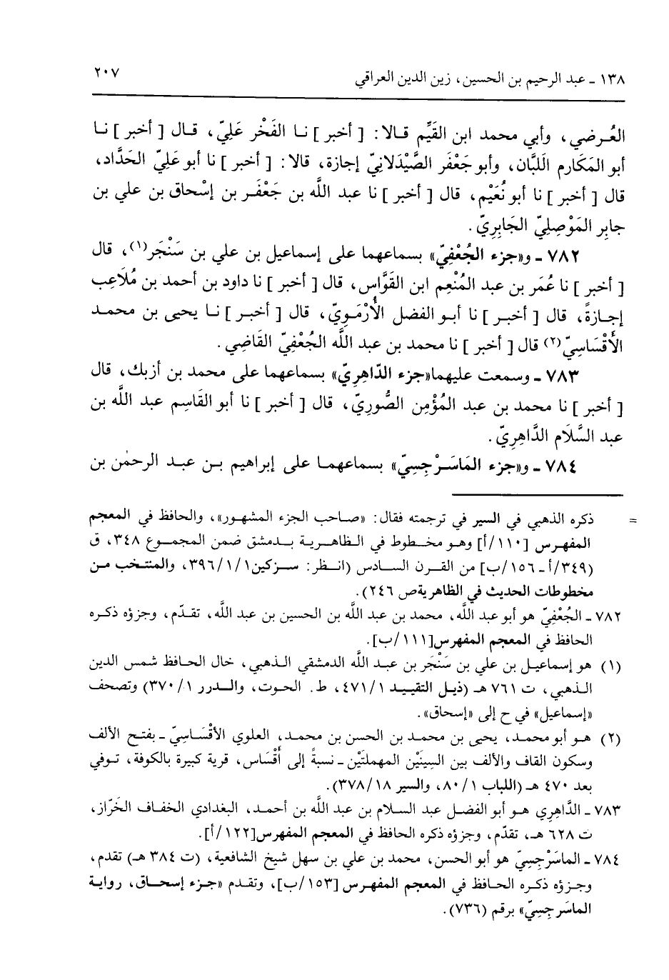 العُرضي وأبي محمد ابن القيم قالا [أخبر] نا الفخر علي قال [أخبر] نا أبو المكارم اللبان وأبو جعفر الصيدلاني إجازة قالا [أخبر] نا أبو علي الحداد قال [أخبر] نا أبو نعيم قال [أخبر] نا عبد الله بن جعفر بن إسحاقق بن علي بن جابر الموصلي الجابري. 782 - و"جزء الجُعفي" بسماعهما على إسماعيل بن علي بن سنجر قال [أخبر] نا عُمر بن عبد المنعم ابن القواس قال [أخبر] نا دواود بن أحمد بن مُلاعب إجازة قال [أخبر] نا أبو الفضل الأرموي قال [أخبر] نا يحيى بن محمد الأقساسي قال [أخبر] نا محمد بن عبد الله الجُعفي القاضي 738 - وسمعت عليهما "جزء الداهري" بسماعهما على محمد بن أزبك قال [أخبر] نا محمد بن عبد المؤمن الصوري قال [أخبر] نا أبو القاسم عبد الله بن عبد السلام الداهري 784 - و"جزء الماسرسجي" بسماعهما على إبراهيم بن عبد الرحمن بن