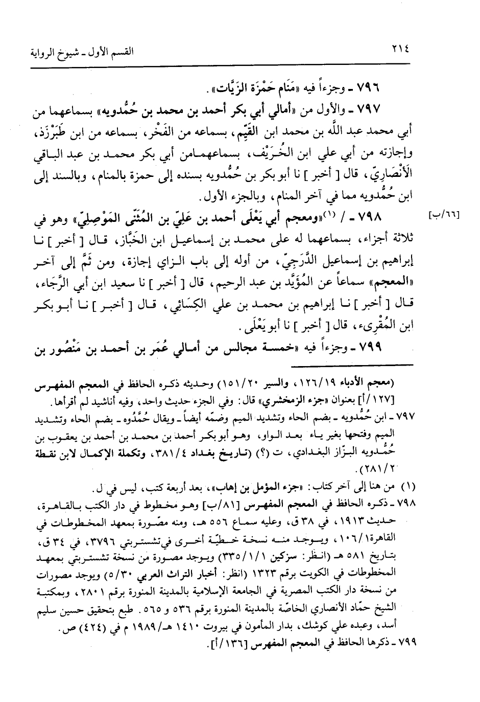 796 - وجزءاً فيه "منام حزة الزيات".797 - والأول من "أمالي أبي بكر أحمد بن محمد بن حمدوية" بسماعهما من أبي محمد عبد الله بن محمد ابن القيم بسماعه من الفخر بسماعه من ابن طبرزذ وإجازة من أبي علي ابن الخريف بسماعهما من أبي بكر محمد بن عبد الباقي الأنصاري قال [أخبر] نا أبو بكر بن حمدوية بسنده إلى حمزة بالمنام وبالسند إلى ابن حمدوية مما فى آخر المنام وبالجزء الأول.