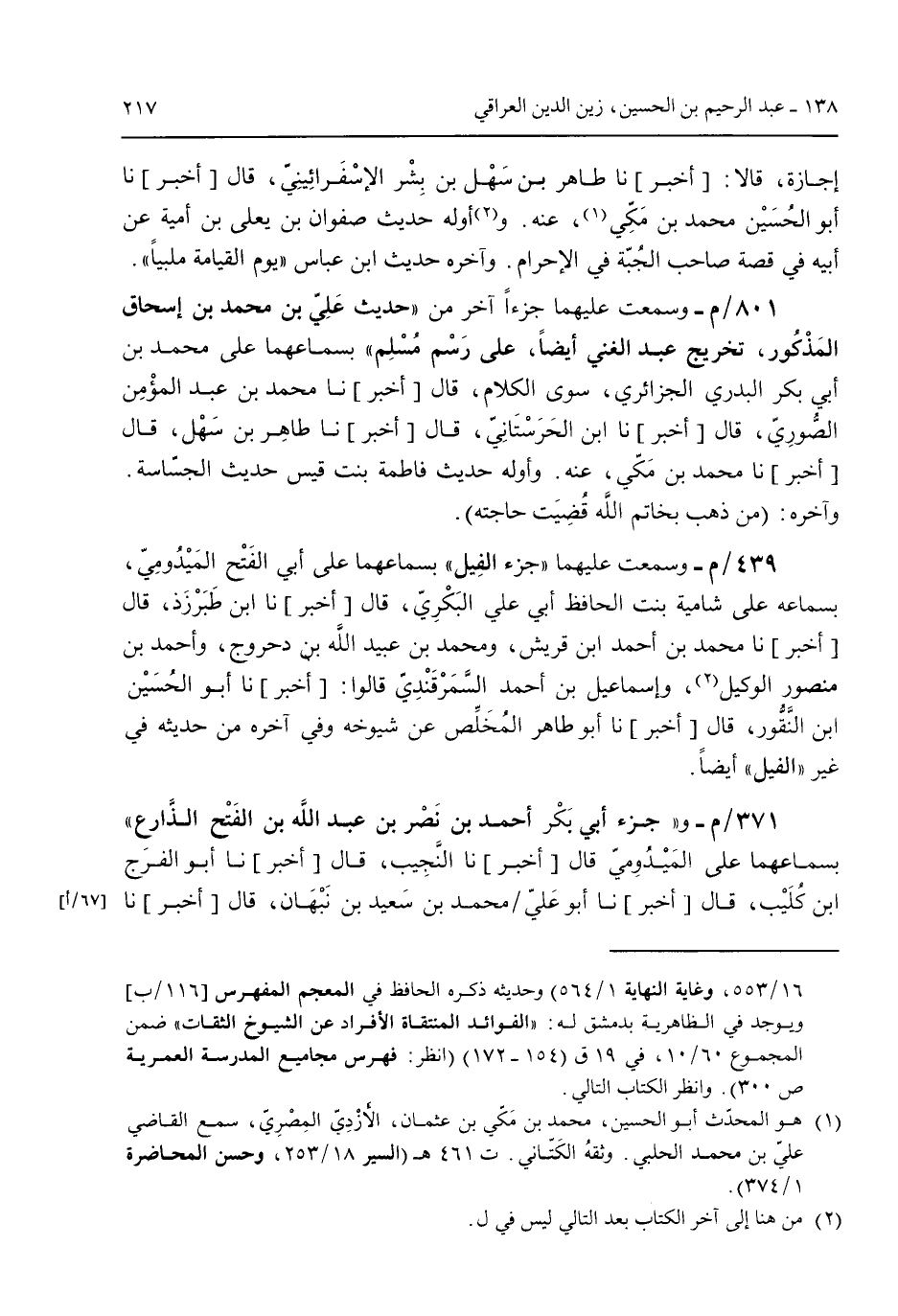 إجازة قالا: [أخبر] نا طاهر بن سهل بن بشر الأسفرائيني قال [أخبر] نا أبو الحسين محمد بن مكي عنه. وأوله حديث صفوان بن يعلي بن أمية عن أبيه فى قصة صاحب الجُبة فى الإحرام. وآخره حديث ابن عباس "يوم القيامة ملبياً".801/م- وسمعت عليهما جزءاً آخر من "حديث علي بن محمد بن إسحاق المذكور تخريج عبد الغني أيضاً على رسم مُسلم" بسماعهما على محمد بن أبي بكر البدري الجزائري سوى الكلام قال [أخبر] نا محمد بن عبد المؤمن الصوري قال [أخبر] نا ابن الحرستاني قال [أخبر] نا طاهر بن سهل قال [أخبر] نا محمد بن مكي عنه. وأوله حديث فاطمة بنت قيس حديث الجساسة. وآخره: (من ذهب بخاتم الله قُضيت حاجته) 439/م- وسمعت عليهما "جزء الفيل" بسماعهما على أبي الفتح الميدومي بسماعه على شامية بنت الحافظ أبي علي البكري قال [أخبر] نا ابن طبرزذ قال [أخبر] نا محمد بن أحمد ابن قريش ومحمد بن عبيد الله بن دحروج وأحمد بن منصور الوكيل وإسماعيل بن أحمد السمرقندي قالوا: [أخبر] نا أبو الحسين ابن النقور قال [أخبر] نا أبو طاهر المخلص عن شيوخه وفى آخره من حديثه فى غير "الفيل" أيضاً. 371/م- و"جزء أبي بكر أحمد بن نصر بن عبد الله بن الفتح الذراع" بسماعهما على الميدومي قال [أخبر] نا النجيب قال [أخبر] نا أبو الفرج ابن كُليب قال [أخبر] نا أبو علي محمد بن سعيد بن نبهان قال [أخبر] نا