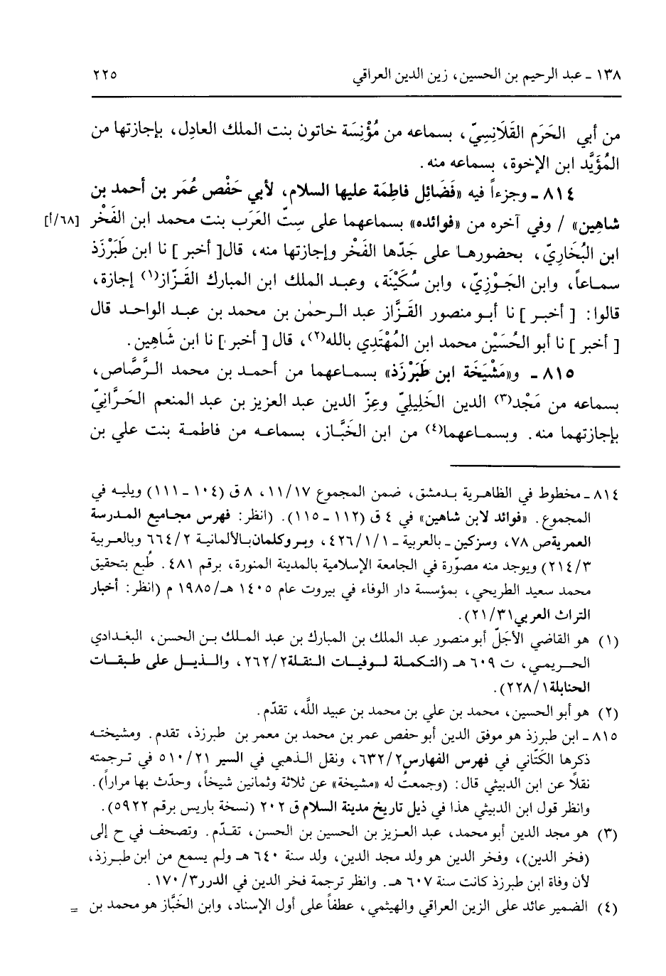 من أبي الحرم القلانسي بسماعه من مؤنسة خاتون بنت الملك العادل بإجازتها من المؤيد ابن الإخوة بسماعه عنه. 814 - وجزءاً فيه "فضائل فاطمة عليها السلام لأبي حفص عُمر بن أحمد بن شاهين" وفي آخره من "فوائده" بسماعهما على ست العرب بنت محمد ابن الفخر ابن البخاري بحضورها على جدها الفخر وإجازتها منه قال [أخبر] نا ابن طبرزذ سماعاً والجوزي وابن سُكينة وعبد الملك ابن المبارك القزاز إجازة قالوا [أخبر] نا أبو منصور القزاز عبد الرحمن بن محمد بن عبد الواحد قال [أخبر] نا أبو الحسين محمد ابن المهتدي بالله قال [أخبر] نا ابن شاهين.815 - و"مشيخة ابن طبرزذ" بسماعهما من أحمد بن محمد الرصاص بسماعه من مجيد الدين الخليلي وعز الدين عبدد العزيز بن عبد المنعم الحراني بإجازتهما منه. وبسماعهما من ابن الخباز بسماعه من فاطمة بنت علي بن