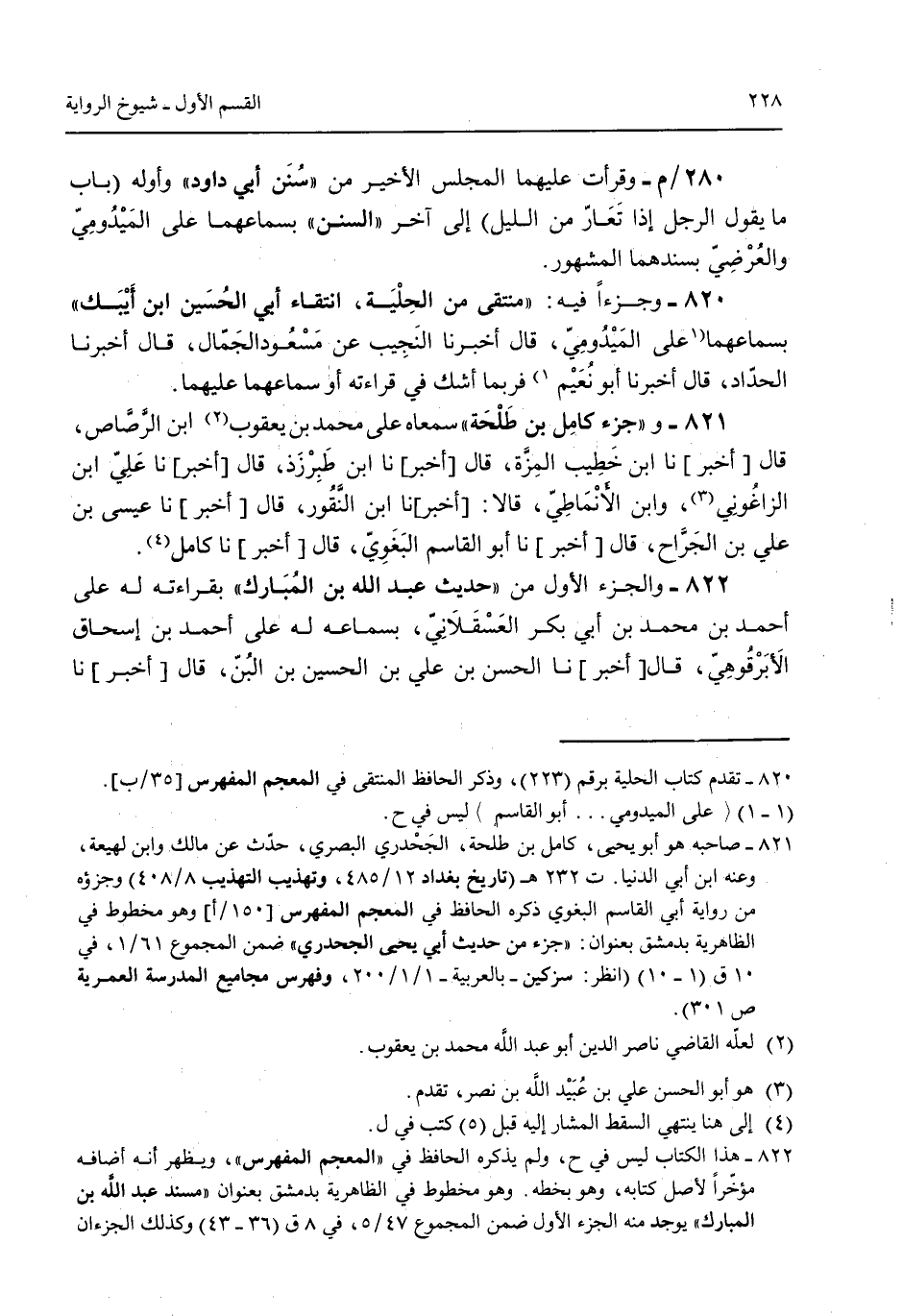 280/م- وقرأت عليهما المجلس الأخير من "سنن أبي داود" وأوله (باب مايقول الرجل إذا تعار من الليل) إلى آخر "السنن" بسماعهما على الميدومي والعُرضي بسندهما المشهور. 820 - وجزءاً فيه: "منتقى من الحلية انتقاء أبي الحسين ابن أيبك" بسماعهما على الميدومي قال [أخبر] نا النجيب عن مسعود الجمال قال [أخبر] نا الحداد قال [أخبر] نا أبو نعيم فربما أشك فى قراءته أو سماعهما عليهما. 821 - و "جزء كامل بن طلحة" سمعاه على محمد بن يعقوب ابن الرصاص قال [أخبر] نا ابن خطيب المزة قال [أخبر] نا ابن طبرزذ قال [أخبر] نا علي ابن الزاغوني وابن الأنماطي قالا: [أخبر] نا ابن النقور قال [أخبر] نا عيسى بن علي بن الجراح قال [أخبر] نا أبو القاسم البغوي قال [أخبر] نا كامل. 822 - والجزء الأول من "حديث عبد الله بن المبارك" بقراءته له على أحمد بن محمد بن أبي بكر العسقلاني بسماعه له على أحمد بن إسحاق الأبرقوهي قال [أخبر] نا الحسن بن علي بن الحسين بن البُن قال [أخبر] نا