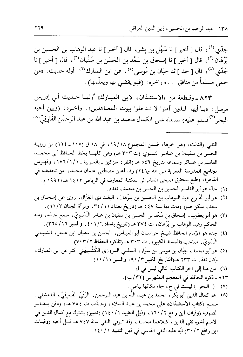823 - وقطعة من "الاستئذان لابن المبارك" أولها حديث أبي إدريس مرسل: "يأيها الذين آمنوا لا تدخلوا بيوت المعاهدين". وآخره: (وبين أخيه البحر فسلم عليه) سمعها على الكمال محمد بن عبد الله بن عبد الرحمن الفارقي