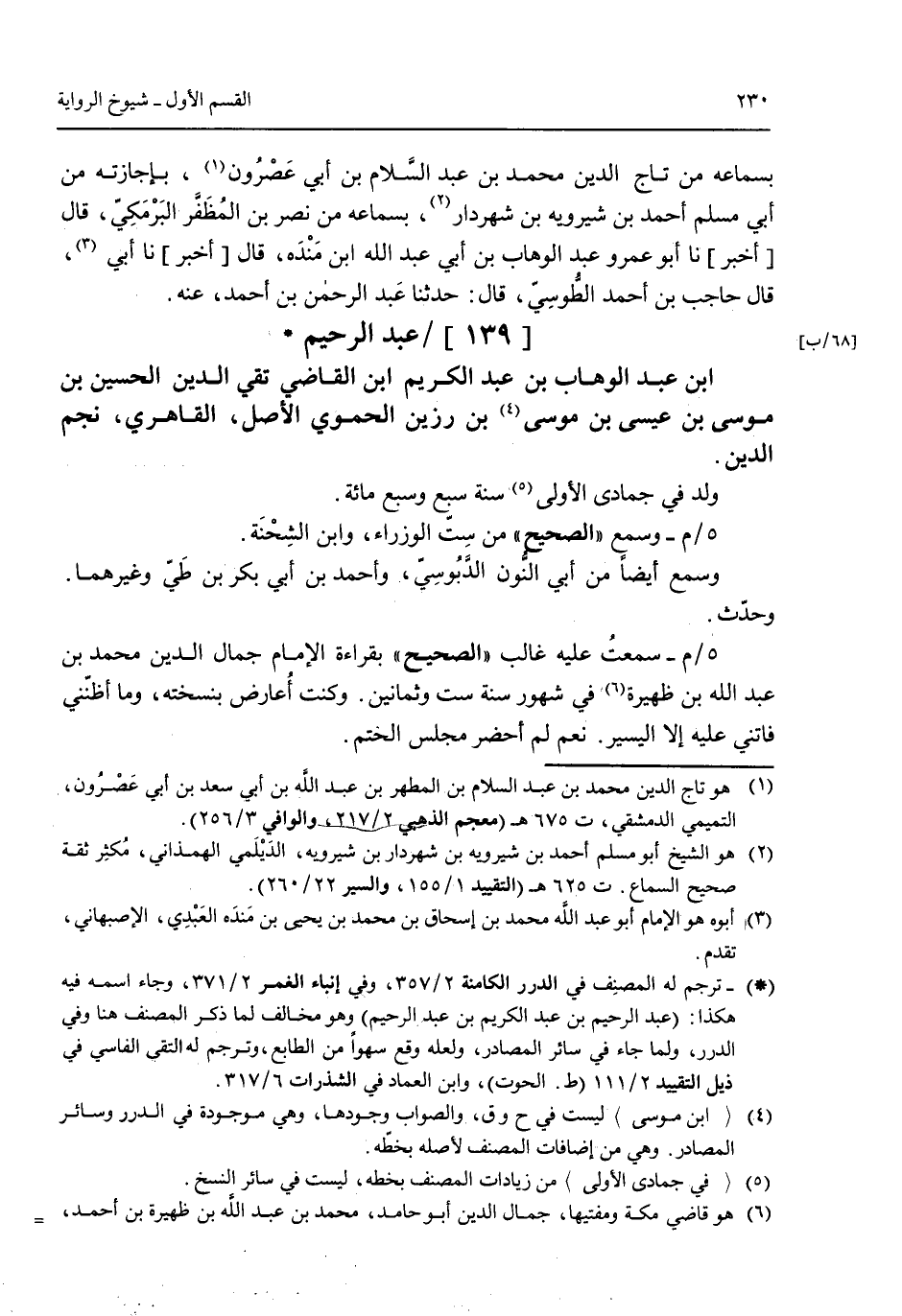 بسماعه من تاج الدين محمد بن عبد السلام بن أبي عصرون بإجازته من أبي مسلم أحمد بن شيرويه بن شهراد بسماعه من نصر بن المُظفر البرمكي قال [أخبر] نا أبو عمرو عبد الوهاب بن أبي عبد الله ابن منده قال [أخبر] نا أبي قال حاجب بن أحمد الطوسي قال: حدثنا عبد الرحمن بن أحمد عنه.