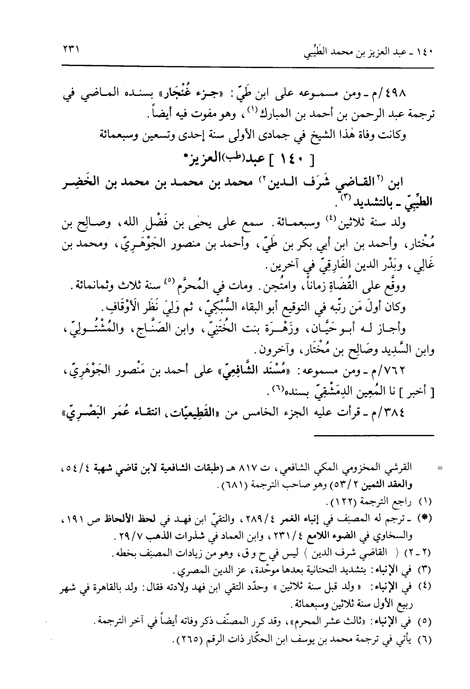[140] عبد العزيز (طب) العزيز ابن القاضي شرف الدين محمد بن محمد بن الخضر الطيبي-بالتشديد.