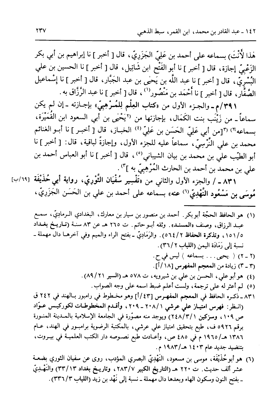 هذا لأنت) بسماعه على أحمد بن علي الجزري قال [أخبر] نا إبراهيم بن أبي بكر الزعبي إجازة قال [أخبر] نا أبو الفتح ابن شاتيل قال [أخبر] نا الحسين بن علي البُسري قال [أخبر] نا عبد الله ين يحيى بن عبد الجبار قال [أخبر] نا إسماعيل الصفار قال [أخبر] نا أحمد بن منصور قال [أخبر] نا عبد الرازق به. 391/م- والجزء الأول من "كتاب العلم للمُرهبي" بإجازته -إن لم يكن سماعاً- من زينب بنت الكمال بإجازتها من يحيى بن أبي السعود ابن القُميرة بسماعه من أبي علي الحسن بن علي الخباز قال [أخبر] نا أبو الغنائم محمد بن علي النرسي سماعاً عليه للجزء الأول وإجازة لباقية قال [أخبر] نا أبو الطيب علي بن محمد بن بيان الشيباني قال [أخبر] نا أبو العباس أحمد بن علي بن محمد بن أحمد بن الحارث المُرهبي به. 831 - والجزء الأول والثاني من "تفسير سفيان الثوري رواية أبي حذيفة موسى بن مسعود النهدي عنه. بسماعه على أحمد بن علي بن الحسن الجزري