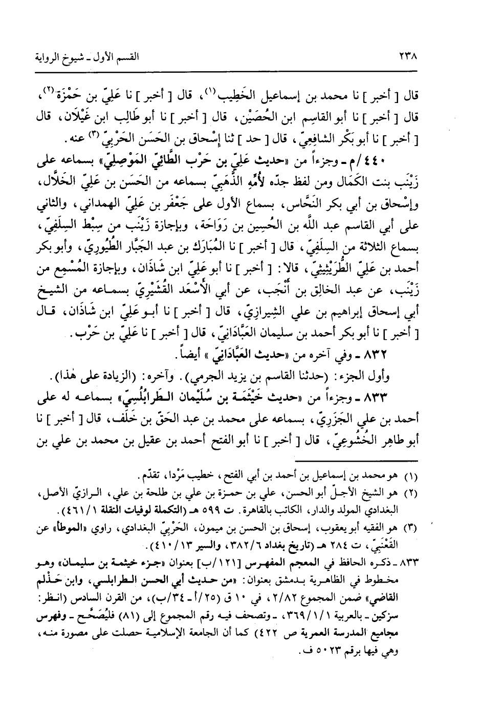 قال [أخبر] نا محمد بن إسماعيل الخطيب قال [أخبر] نا علي بن حمزة قال [أخبر] نا أبو القاسم ابن الحُصين قال [أخبر] نا أبو طالب ابن غيلان قال [أخبر] نا أبو بكر الشافعي قال [حد] ثنا إسخاق بن الحسن الحربي عنه. 440/م- وجزءاً من "حديث علي بن حرب الطائي الموصلي" بسماعه على زينب بنت الكمال ومن لفظ جده لأمه الذهبي بسماعه من الحسن بن علي الخلال وإسحاق بن أبي بكر النحاس بسماع الأول على جعفر بن علي الهمداني والثاني على أبي القاسم عبد الله بن الحسين بن رواحة وبإجازة زينب من سبط السلفي بسماع الثلاثة من السلفي قال [أخبر] نا المُبارك بن عبد الجبار الطيوري وأبو بكرأحمد بن علي الطريثيثي قالا [أخبر] نا أبو علي ابن شاذان وبإجازة المسمع من زينب عن عبد الخالق بن أنجب عن أبي الأسعد القُشيري بسماعه من الشيخ أبي إسحاق إبراهيم بن علي الشيرازي قال [أخبر] نا أبو علي ابن شاذان قال [أخبر] نا أبو بكر أحمد بن سليمان العباداني قال [أخبر] نا علي بن حرب. 832 - وفى آخره من "حديث العباداني" أيضاً. وأول الجزء: (حدثنا القاسم بن يزيد الجرمي. وآخره: (الزيادة على هذا). 833 - وجزءاً من "حديث خيثمة بن سليمان الطرابلسي" بسماعه له أحمد بن علي الجزري بسماعه على محمد بن عبد الحق بن خلف قال [أخبر] نا أبو طاهر الخُشوعي قال [أخبر] نا أبو الفتح أحمد بن عقيل بن محمد بن علي بن