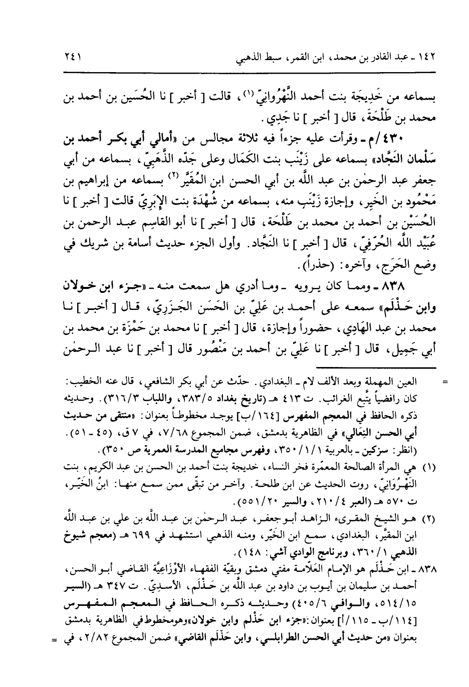 بسماعه من خديجة بنت أحمد النهرواني قالت [أخبر] نا الحسين بن أحمد بن محمد بن طلحة قال [أخبر] نا جدي. 430/م- وقرات عليه جزءاً فيه ثلاثة مجالس "أمالي أبي بكر أحمد بن سلمان النجاد" بسماعه على زينب بنت الكمال وعلى جده الذهبي بسماعه من أبي جعفر عبد الرحمن بن عبد الله بن أبي الحسن ابن المُقير بسماعه من إبراهيم بن محمود بن الخير إجازة زينب منه بسماعه من شُهدة بنت الإبري قالت [أخبر] نا الحُسين بن أحمد بن محمد بن طلحة قال [أخبر] نا أبو القاسم عبد الرحمن عُبيد الله الحُرفي قال [أخبر] نا النجاد. وأول الجزء حديث أسماة بن شريك في وضع الحرج وآخره: (حذراً). 838 - ومما كان يوريه -وما أدري هل سمعت منه- "جزء ابن خولان وابن حذلم" سمعه على أحمد بن علي بن الحسن الجزري قال [أخبر] نا محمد بن عبد الهادي حضوراً وإجازة قال [أخبر] نا محمد بن جمزة بن محمد بن أبي جميل قال [أخبر] نا علي بن أحمد بن منصور قال [أخبر] نا عبد الرحمن