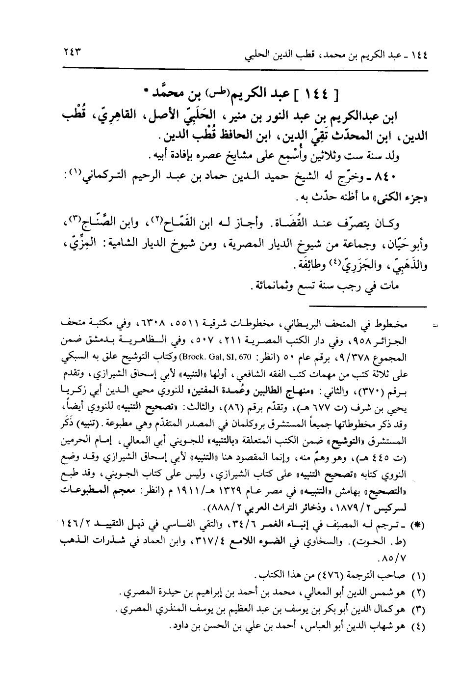 [144] عبد الكريم (طس) بن محمد ابن عبد الكريم بن عبد النور بن منير الحلبي الأصل القاهري قُطب الدين ابن المحدث تقي الدين ابن الحافظ قطب الدين.