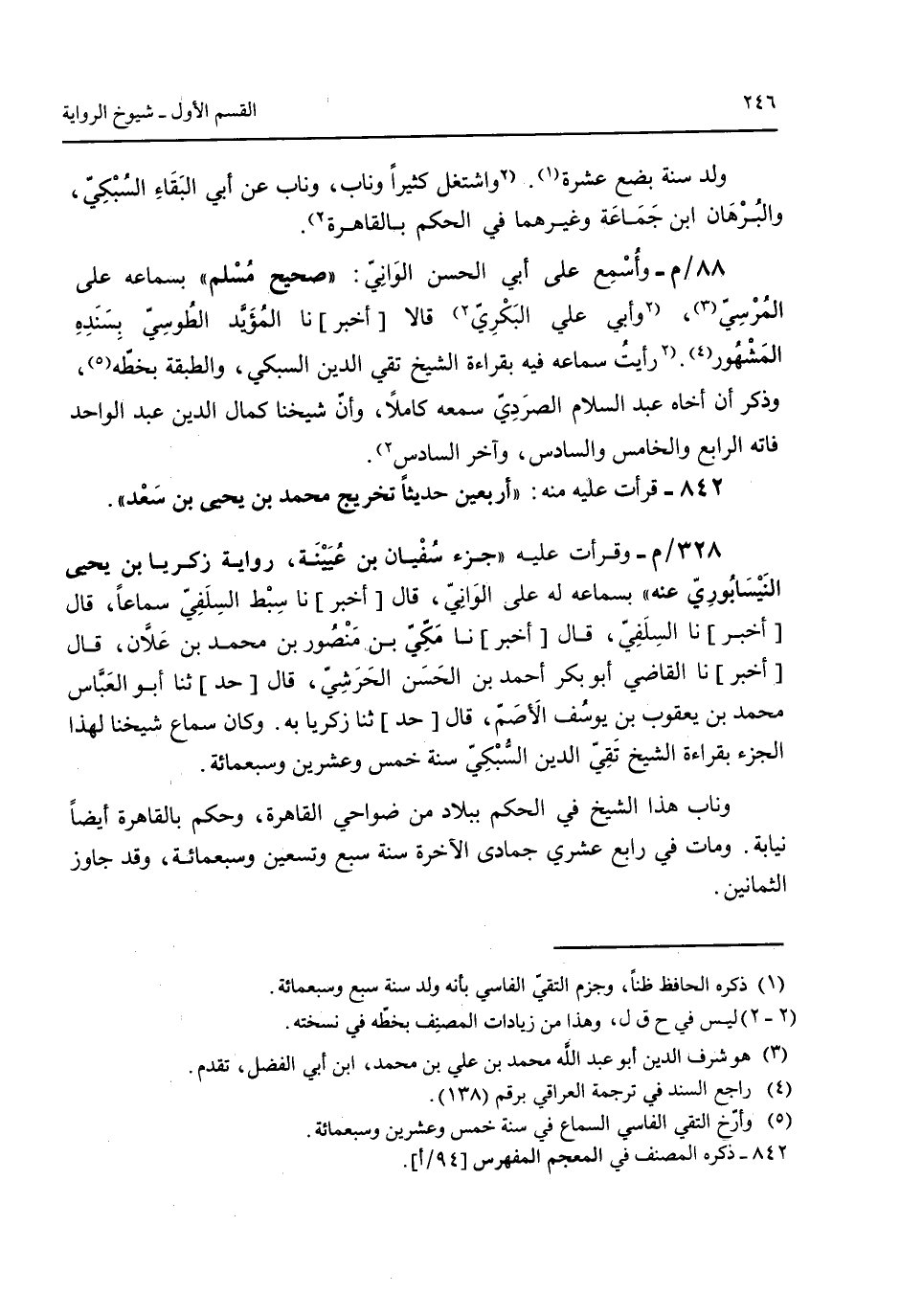 ولد سنة بضع عشرة. واشتغل كثيراً وناب عن أبي البقاء السُبكي والبرهان ابن جماعة وغيرهما في الحكم بالقاهرة. 88/م- وأسمع على أبي الحسن الواني: "صحيح مسلم" بسماعه على المُرسي وأبي البكري قالا [أخبر] نا المؤيد الطوسي بسنده المشهور. رأيت سماعه فيه بقراءة الشيخ تقي الدين السبكي والطبقة بخطخ وذكر أن اخاه عبد السلام الصردي سمعه كاملاً وأن شيخنا كمال الدين عبد الواحد فاته الرابع والخامس والسادس وآخر السادس. 842 - قرأت عليه منه: "أربعين حديثاً تخريج محمد بن يحيى بن سعد" 328/م وقرأت عليه "جزء سفيان بن عيينة رواية زكريا بن يحيى النسيابوري عنه" بسماعه له على الواني قال [أخبر] نا سبط السلفي سماعاً قال [أخبر] نا السلفي قال [أخبر] نا مكي بن منصور بن محمد بن علان قال [أخبر] نا القاضي أبو بكر أحمد بن الحسن الحرشي قال [حد] ثنا أبو العباس محمد بن يعقوب بن يوسف الأصم قال [حد] ثنا زكريا به. وكان سماع شيخنا لهذا الجزء بقراءة الشيخ تقي الدين السبكي سنة خمس وعشرين وسبعمائة. وناب هذا الشيخ في الحكم ببلاد ضواحي القاهرة وحكم بالقاهرة أيضاً نيابة. ومات في رابع عشري جمادى الآخرة سنة سبع وتسعين وسبعمائة وقد جاوز الثمانين.