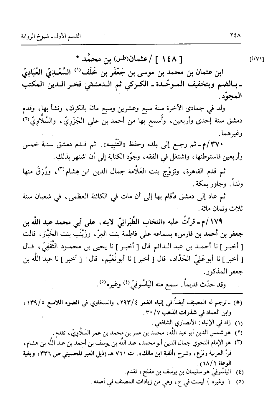 [148] عثمان (طس) بن محمد ابن عثمان بن محمد بن موسى بن جعفر بن خلف السعدي العُبادي -بالضم وبتخفيف الموحدة- الكركي ثم الدمشقي فخر الدين المكتب المجود.