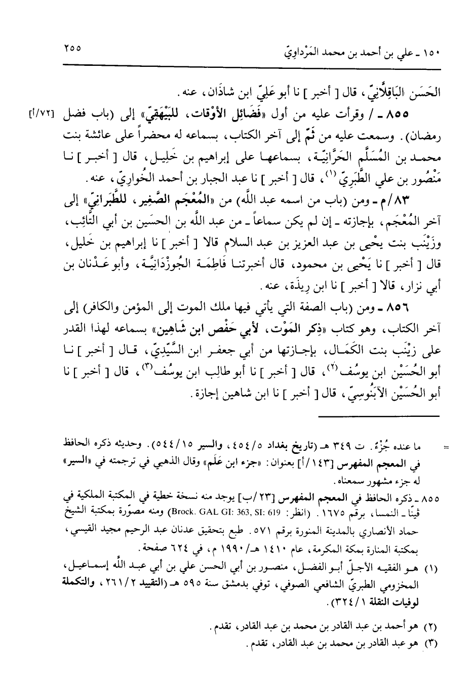 الحسن الباقلاني قال [أخبر] نا أبو علي ابن شاذان عنه. 855 - وقرأت عليه من أول "فضائل الأوقات للبيقهي" إلى (باب فضل رمضان). وسمعت عليه من قم إلى آخر الكتاب بسماعه له محضراً على عائشة بنت محمد بن المسلم الحرانية بسماعها على إبراهيم بن خليل قال [أخبر] نا منصور بن علي الطبري قال [أخبر] نا عبد الجبار بن أحمد الخواري عنه. 83/م- ومن (باب من اسمه عبد الله) من "المعجم الصغير للطبراني" إلى آخر المعجم بإجازته -إن لم يكن سماعاً- من عبد الله بن الحسين بن أبي التائب وزينب بنت يحيى بن عبد العزيز بن عبد السلام قالا [أخبر] نا إبراهيم بن خليل قال [أخبر] نا يحيى بن محمود قال [أخبر] تنا فاطمة الجوزدانية وأبو عدنان بن أبي نزار قالا [أخبر] نا ابن ريذة عنه. 856 - ومن (باب الصفة التي يأتي فيها ملك الموت إلى المؤمن والكافر) إلى آخر الكتاب وهو كتاب "ذكر الموت لأبي حفص ابن شاهين" بسماعه لهذا القدر على زينب بنت الكمال بإجازتها من أبي جعفر ابن السيدي قال [أخبر] نا أبو الحسين ابن يوسف قال [أخبر] نا أبو طالب ابن يوسف قال [أخبر] نا أبو الآبنوسي قال [أخبر] نا ابن شاهين إجازة.