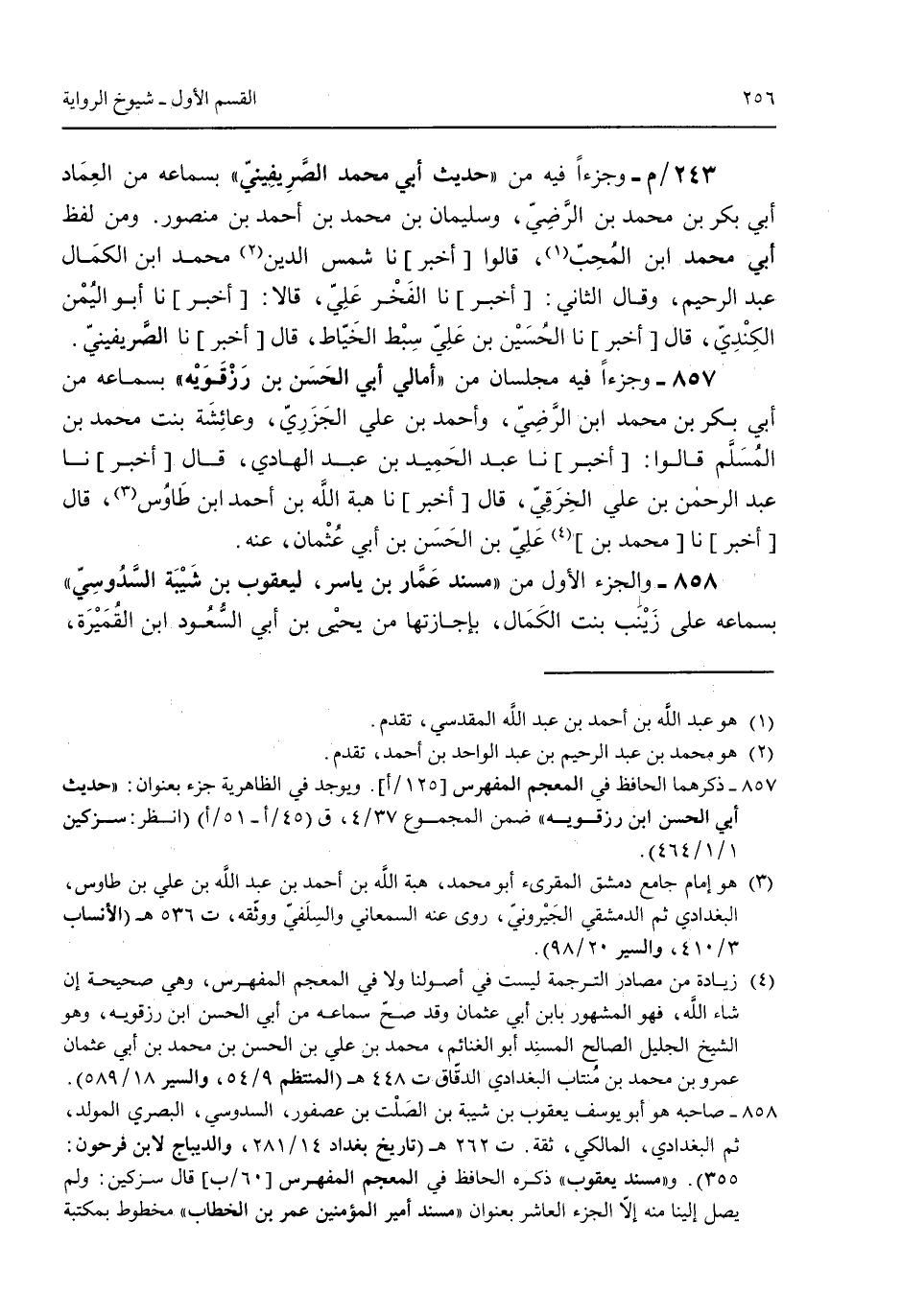 243/م- وجزءاً فيه من "حديث أبي محمد الصيرفيني" بسماعه من العماد أبي بكر بن محمد بن الرضي وسليمان بن محمد بن أحمد بن منصور. ومن لفظ أبي محمد ابن المحب قالوا [أخبر] نا شمس الدين محمد ابن الكمال عبد الرحيم وقال الثاني: [أخبر] نا الفخر علي قالا: [أخبر] نا أبو اليمن الكندي قال [أخبر] نا الحسين بن علي سبط الخياط قال [أخبر] نا الصيرفيني. 857 - وجزءاً فيه مجلسان من "أمالي أبي الحسن بن رزقوية" بسماعه من أبي بكر بن محمد ابن الرضي وأحمد بن علي الجزري وعائشة بنت محمد بن المسلم قالوا: [أخبر] نا عبد الحميد بن عبد الهادي قال [أخبر] نا عبد الرحمن بن علي الخرقي قال [أخبر] نا هبة الله بن أحمد بن طاوس قال [أخبر] نا محمد بن علي بن الحسن بن أبي عُثمان عنه. 858 - والجزء الأول من "مسند عمار بن ياسر ليعقوب بن شيبة السدوسي" بسماعه على زينب بنت الكمال بإجازتها من يحيى بن أبي السعويد ابن القميرة
