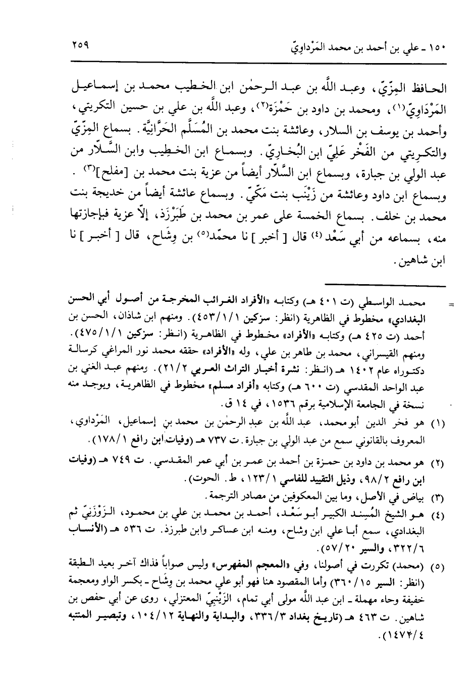 الحافظ المزي وعبد الله بن عبد الرحمن ابن الخطيب محمد بن إسماعيل المرداوي ومحمد بن داود بن حمزة وعبد الله بن علي بن حسين التكريتي وأحمد بن يوسف بنالسلار وعائشة بنت محمد بن المسلم الحرانية. بسماع المزي والتكريتي من الفخر علي ابن البُخاري. وبسماع ابن الخطيب وابن السلار من عبد الوالي بن جبارة وبسماع ابن السلار أيضاً من عزية بنت محمد بن مفلح وبسماع ابن داود وعائشة من زينب بنت مكي. وبسماع عائشة أيضاً من خديجة بنت محمد بن خلف. بسماع الخمسة على عمر بن محمد بن طبرزذ إلا عزية فبإجازتها منه بسماعه من أبي سعد قال [أخبر] نا محمد بن وشاح قال [أخبر] نا ابن شاهين.