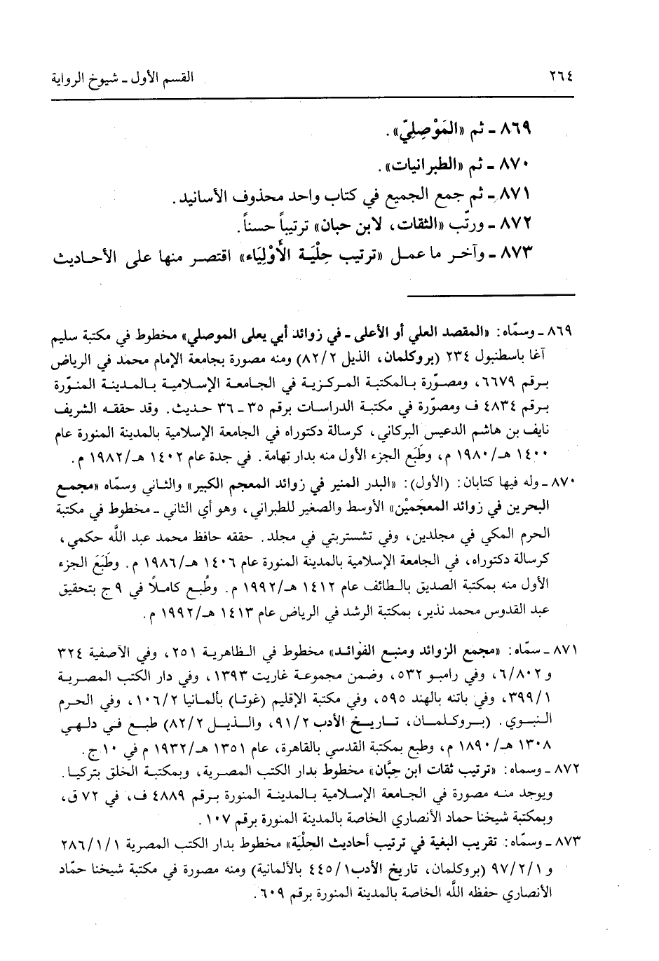 869 - ثم "الموصلي". 870 - ثم "الطبرانيات". 871 - ثم جمع الجميع في كتاب واحد محذوف الأسانيد. 872 - وآخر ما عمل "ترتيب حلية الأولياء" اقتصر منها على الأحاديث