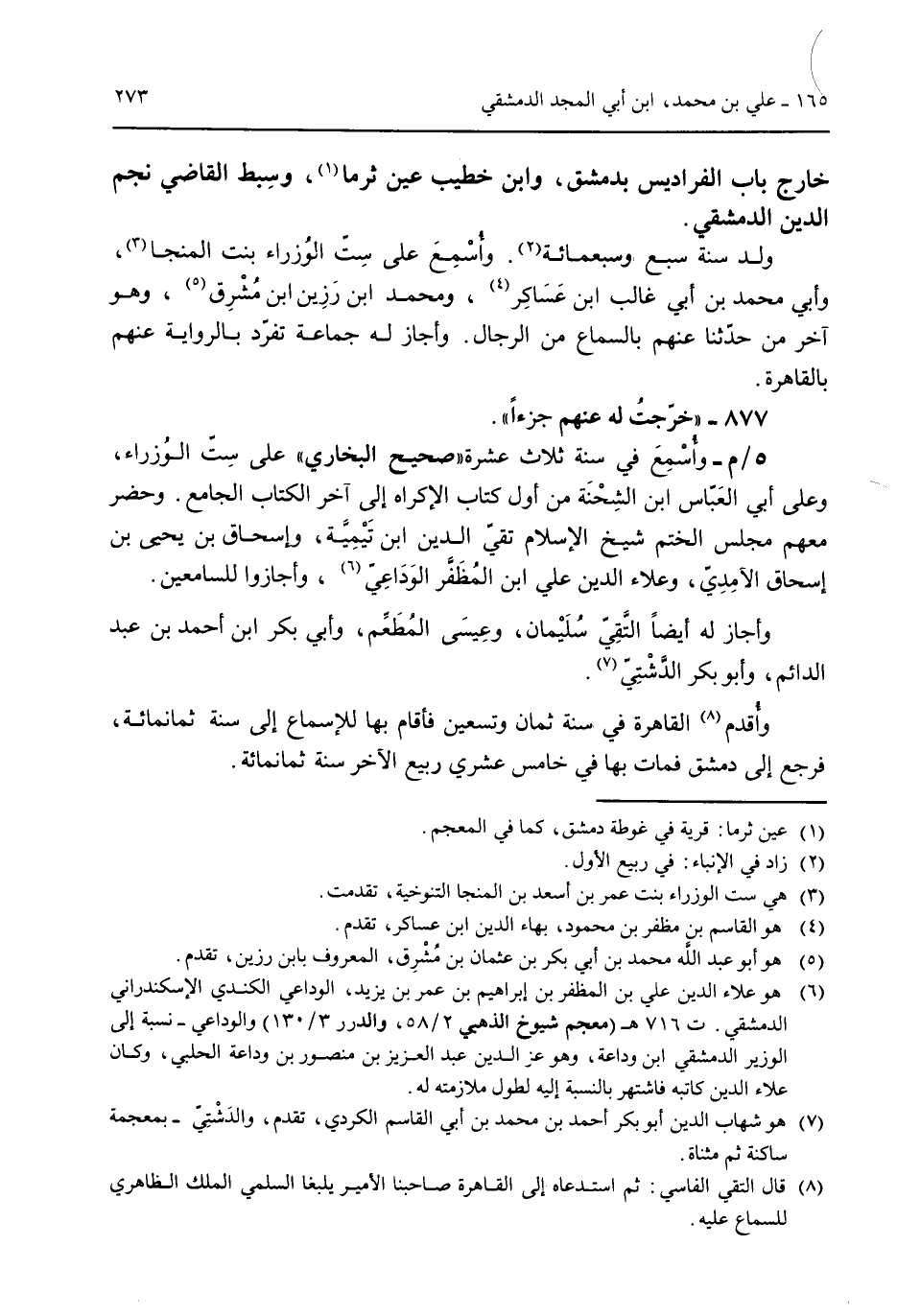 خارج باب الفراديس بدمشق وابن خطيب عين ثرما وسبط القاضي نجم الدين الدمشقي. ولد سنة سبع وسبعمائة. وأسمع على ست الوزراء بنت المنجا وأبي محمد بن أبي غالب ابن عساكر ومحمد ابن رزين ابن مُشرق وهو آخر من حدثنا عنهم بالسماع من الرجل. وأجاز له جماعة تفرد بالرواية عنهم بالقاهرة. 877 - "خرجت له عنهم جزءاً". 5/م- وأسمع في سنة ثلاث عشرة "صحيح البخاري" على ست الوزراء وعلى أبي العباس ابن الشحنة من أول كتاب الإكراه إلى آخر الكتاب الجامع. وحضر معهم مجلس الختم شيخ الإسلام نقي الدين ابن تيمية وإسحاق بن يحيى بن إسحاق الآمدي وعلاء الدين علي ابن المظفر الوداعي وأجازوا للسامعين. وأجاز له أيضاً التقي سليمان وعيسى المُطعم وأبي بكر ابن أحمد بن عبد الدائم وأبو بكر الدشتي. وأقدم القاهرة في سنة ثمان وتسعين فأقام بها للإسماع إلى سنة ثمانمائة فرجع إلى دمشق فمات بها في خامس عشري ربيع الآخر سنة ثمانمائة.