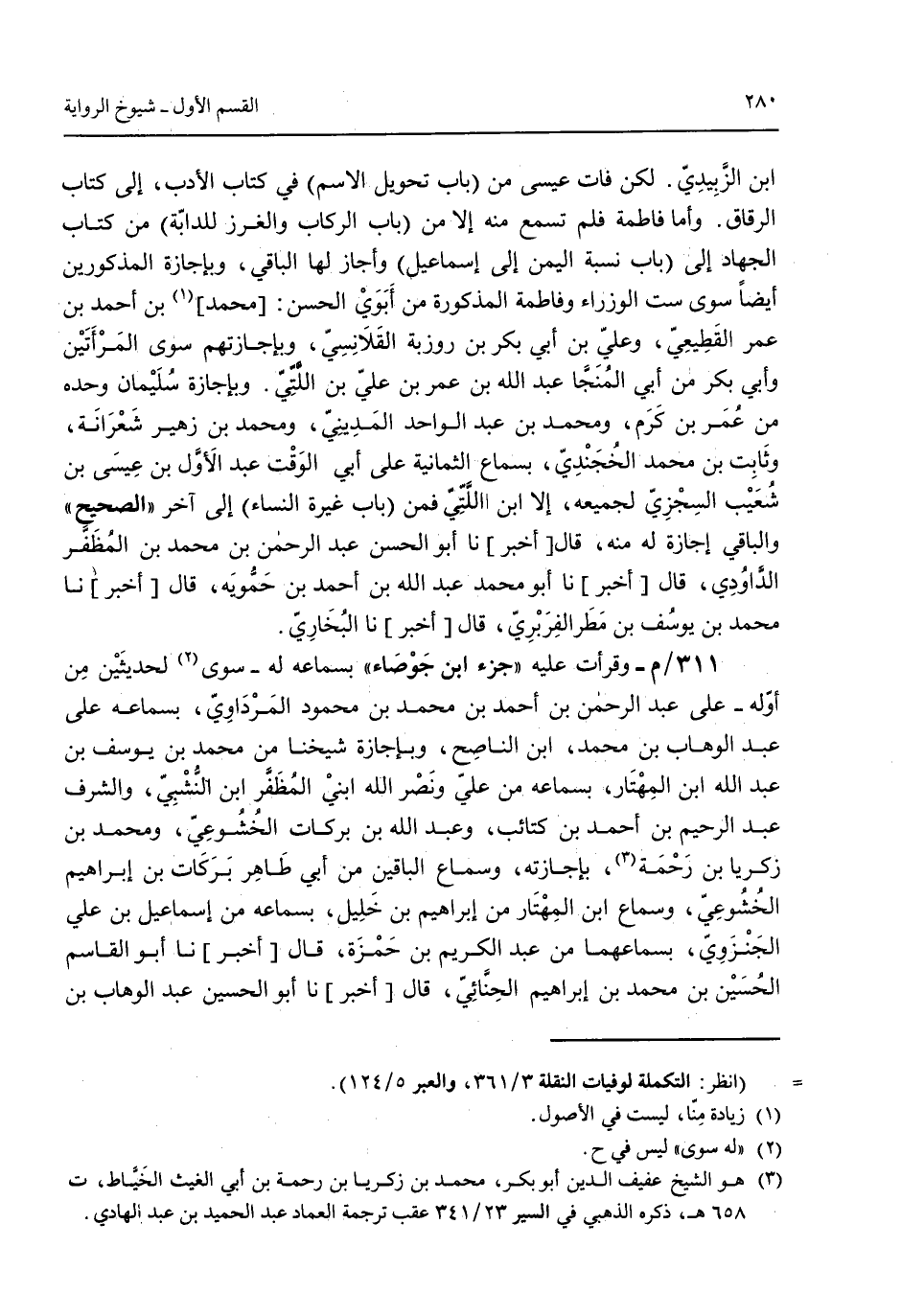 ابن الزبيدي. لكن فات عيسى من (باب تحويل الاسم) فى كتاب الأدب إلى كتاب الرقاق واما فاطمة فلم تسمع منه إلا من (باب) الركاب والغرز للدابة) من كتاب الجهاد إلى (باب نسبة إلى إسماعيل) وأجاز لها الباقي وبإجازة المذكورين أيضاً سوى ست الوزراء وفاطمة المذكورة من أبوي الحسن: محمد بن أحمد عمر القطيعي وعلي بن أبي بكر بن روزبة القلانسي وبإجازتهم سوى المرأتين وأبي بكر من أبي المنجا عبد الله بن عمر بن علي بن اللتي وبإجازة سليمان وحده من عمر بن كرم ومحمد بن عبد الواحد المديني ومحمد بن زهير شعرانة وثابت بن محمد الخُجندي بسماع الثمانية على أبي الوقت عبد الأول بن عيسى بن شعيب السجزي لجميعه إلا ابن اللتي فمن (باب غيرة النساء) إلى آخر "الصحيح" والباقي إجازة له منه قال [أخبر] نا أبو الحسن عبد الرحمن بن محمد بن المظفر الداودي قال [أخبر] نا أبو محمد عبد الله بن أحمد بن حموية قال [أخبر] نا محمد بن يوسف بن مطر الفربري قال [أخبر] نا البخاري. 311/م- وقرأت عليه "جزء ابن جوصاء" بسماعه له -سوى لحديثين من أوله- على عبد الرحمن بن أحمد بن محمد بن محمود المرداوي بسماعه على عبد الوهاب بن محمد ابن الناصح وبإجازة شيخنا من محمد بن يوسف بن عبد الله ابن المهتار بسماعه من علي ونصر الله ابني المُظفر ابن النشبي والشرف عبد الرحيم بن أحمد بن كتائب وعبد الله بن بركات الخشوعي ومحمد بن زكريا بن رحمة بإجازته وسماع الباقين من أبي طاهر بركات بن إبراهيم الخُشوعي وسماع ابن المهتار من إبراهيم بن خليل بسماعه من إسماعيل بن علي الجنزوي بسماعهما من عبد الكريم بن حمزة قال [أخبر] نا أبو القاسم الحسين بن محمد بن إبراهيم الحنائي قال [أخبر] نا أبو الحسين عبد الوهاب بن