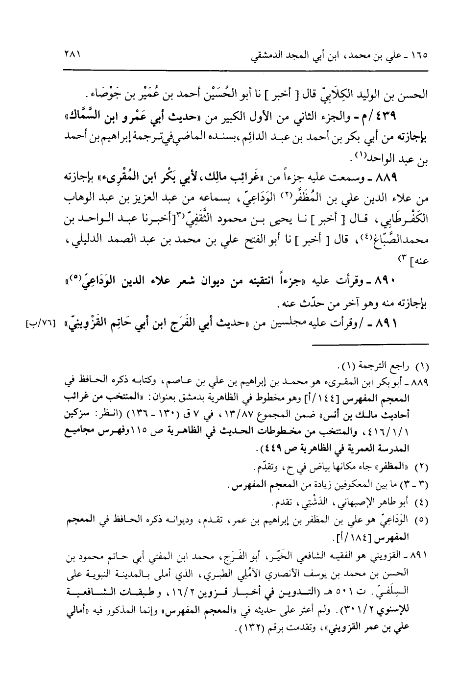 الحسن بن الوليد الكلابي قال [أخبر] نا أبو الحسين أحمد بن عُمير بن جوصاء. 439/م- والجزء الثاني من الأول الكبير من "حديث أبي عمرو ابن السماك" بإجازته من أبي بكر بن أحمد بن عبد الدائم بسنده الماضي فى ترجمة إبراهيم بن أحمد بن عبد الواحد. 889 - وسمعت عليه جزءاً من "غرائب مالك لأبي بكر ابن المقري" بإجازته من علاء الدين علي بن المظفر الوداعي بسماعه من عبد العزيز بن عبد الوهاب الكفرطابي قال [أخبر] نا يحيى بن محمود الثقفي أخبرنا عبد الواحد بن محمد الصباغ قال [أخبر] نا أبو الفتح علي بن محمد بن عبد الصمد الدليلي عنه. 890 - وقرأت عليه "جزءاً انتقيته من ديوان شعر علاء الدين الوداعي" بإجازته منه وهو آخر من حدث عنه. 891 - وقرأت عليه مجلسين من "حديث أبي الفرج ابن أبي حاتم القزويني"