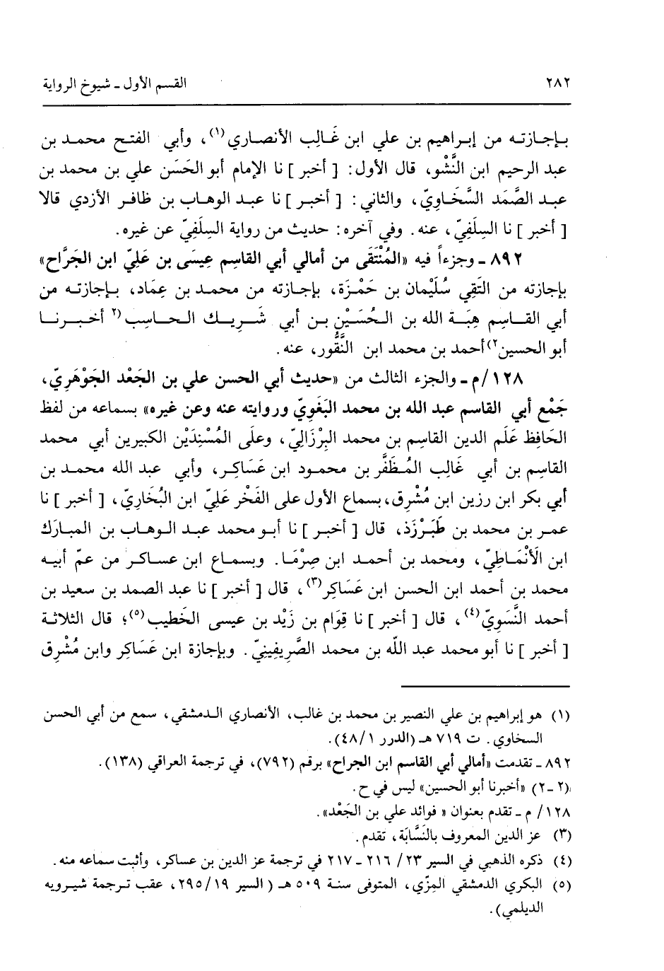 بإجازته من إبراهيم بن علي ابن غالب الأنصاري وأبي الفتح محمد بن عبد الرحيم ابن النشو قال الأول [أخبر] نا الإمام أبو الحسن علي بن محمد عبد الصمد السخاوي والثاني: [أخبر] نا عبد الوهاب بن ظافر الأزدي قالا [أخبر] نا عنه. وفى آخره: حديث من رواية السلفي عن غيره. 892 - وجزءاً فيه "المنتقى من أمالي أبي القاسم عيسى بن علي ابن الجراح" بإجازته من التقي سليمان بن حمزة بإجازته من محمد بن عماد بإجازته من أبي القاسم هبة الله بن الحسين بن أبي شريك الحاسب أخبرنا أبو الحسن أحمد بن محمد بن النقور عنه. 128/م- والجزء الثالث من "حديث أبي الحسن علي بن الجعد الجوهري جمع أبي القاسم عبد الله بن محمد البغوي وروايته عنه وعن غيره" بسماعه من لفظ الحافظ علم الدين القاسم بن محمد البرازلي وعلى المسندين الكبيرين أبي محمد القاسم بن أبي غالب المظفر بن محمود ابن عساكر وأبي عبد الله محمد بن أبي بكر ابن رزين ابن مُشرق بسماع الأول على الفخر علي ابن البخاري [أخبر] نا عمر بن محمد بن طبرزذ قال [أخبر] نا أبو محمد عبد الوهاب بن المبارك بن الأنماطي ومحمد بن أحمد بن صِرما وبسماع ابن عساكر من عم أبيه محمد بن أحمد ابن الحسن ابن عساكر قال [أخبر] نا عبد الصمد بن سعيد بن أحمد النسوي قال [أخبر] نا قوام بن زيد بن عيسى الخطيب قال الثلاثة [أخبر] نا أبو محمد عبد الله بن محمد الصيرفيني. وبإجازة ابن عساكر وابن مُشرق