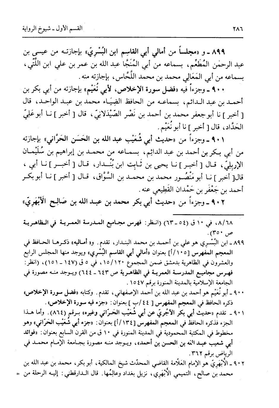 899 - و"مجلساً من أمالي أبي القاسم ابن البُسري" بإجازته من عيسى بن عبد الرحمن المطعم بسماعه من أبي المنجا عبد الله بن عمر بن علي ابن اللتي بسماعه من أبي المعالي محمد بن محمد اللحاس بإجازته منه. 900 - وجزءاً فيه "فضل سورة الإخلاص لأبي نعيم" بإجازته من أبي بكر بن أحمد بن عبد الدائم بسماعه من الحافظ الضياء محمد بن عبد الواحد قال [أخبر] نا أبو جعفر محمد بن أحمد بن نصر الصيدلاني قال [أخبر] نا أبو علي الحداد قال [أخبر] نا أبو نعيم. 901 - وجزءاً من "حديث أبي شعيب عبد الله بن الحسن الحراني" بإجازته من أبي بكر بن أحمد بن عبد الدائم بسماعه من محمد بن إبراهيم بن سليمان الإربلي قال [أخبر] نا يحيى بن ثابت ابن بُندار قال [أخبر] نا أبيقال [أخبر] نا أبو منصور محمد بن السواق قال [أخبر] نا أبو بكر أحمد بن جعفر بن حمدان القطيعي عنه. 902 - وجزءاً من "حديث أبي بكر محمد بن عبد الله بن صالح الأبهري"