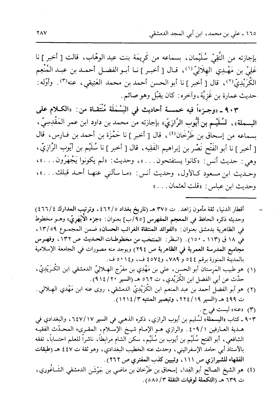 بإجازته من التقي سليمان بسماعه من كريمة بنت عبد الوهابقالت [أخبر] نا علي بن مهدي الهلالي قال [أخبر] نا أبو الفضل أحمد بن عبد المنعم الكريدي قال [أخبر] نا أبو الحسن أحمد بن محمد العتيقي عنه. وأوله: حديث عمارة بن غزية وآخره: كان يقبل وهو صائم. 903 - "وجزءاً قيه خمسة احاديث فى البسملة مُنتقاه من: "الكلام على البسملة" لسليم بن أيوب الرازي" بإجازته من محمد بن داود ابن عمر المقدسي بسماعه من إسحاق بن طرخان قال [أخبر] نا حمزة بن أحمد بن فارس قال [أخبر] نا أبو الفتح نصر بن إبراهيم الفقيه قال [أخبر] نا سليم بن أيوب الرازي وهى: حديث أنس: "كانوا يستفتحون ... " وحديث: "لم يكونوا يجهزون ... " وحديث ابن مسعود كالأول وحديث أنس: "ما سألني عنها أحد قبلك ... " وحديث ابن عباس: "قلت لعثمان ... "