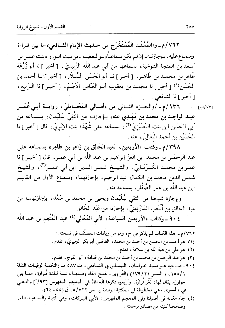 762/م- و"المسند المستخرج من حديث الإمام الشافعي" ما بين قراءة وسماع عليه بإجازته -إن لم يكن سماعاً ولو لبعضه- من ست الوزراء بنت عمر بن أسعد من المنجا التنوخية بسماعها من أبي عبيد الله الزبيدي [أخبر] نا أبو زرعة طاهر بن محمد بن طاهر [أخبر] نا أبو الحسن السلار [أخبر] نا أحمد بن الحسن [أخبر] نا محمد بن يعقوب أبو العباس الأصم [أخبر] نا الربيع [أخبر] نا الشافعي. 136/م- والجزء الثاني من "أمالي المحاملي رواية أبي عمر عبد الواحد بن محمد بن مهدي عنه" بإجازته من التقي سليمان بسماعه من أبي الحسن ابن بنت الجميزي بسماعه على شهدة بنت الإبري قال [أخبر] نا الحسين بن أحمد النعالي عنه. 398/م- وكتاب "الأربعين لعبد الخالق بن زاهر بن طاهر" بسماعه على عبد الرحمن بن محمد ابن العز إبراهيم بن عبد الله بن أبي عمر قال [أخبر] نا عمر بن محمد الكرماني والشيخ شمس الدين ابن أبي عمر والشيخ شمس الدين محمد بن الكمال عبد الرحيم بإجازتهما وسماع الأول من القاسم ابن عبد الله بن عمر الصفار بسماعه منه. وبإجازة شيخنا من التقي سليمان ويحيى بن محمد بن سعد بإجازتهما من عبد الخالق بن أنجب المارديني بإجازته من عبد الخالق. 904 - وكتاب "الأربعين السباعية لأبي المعالي عبد المنعم بن عبد الله