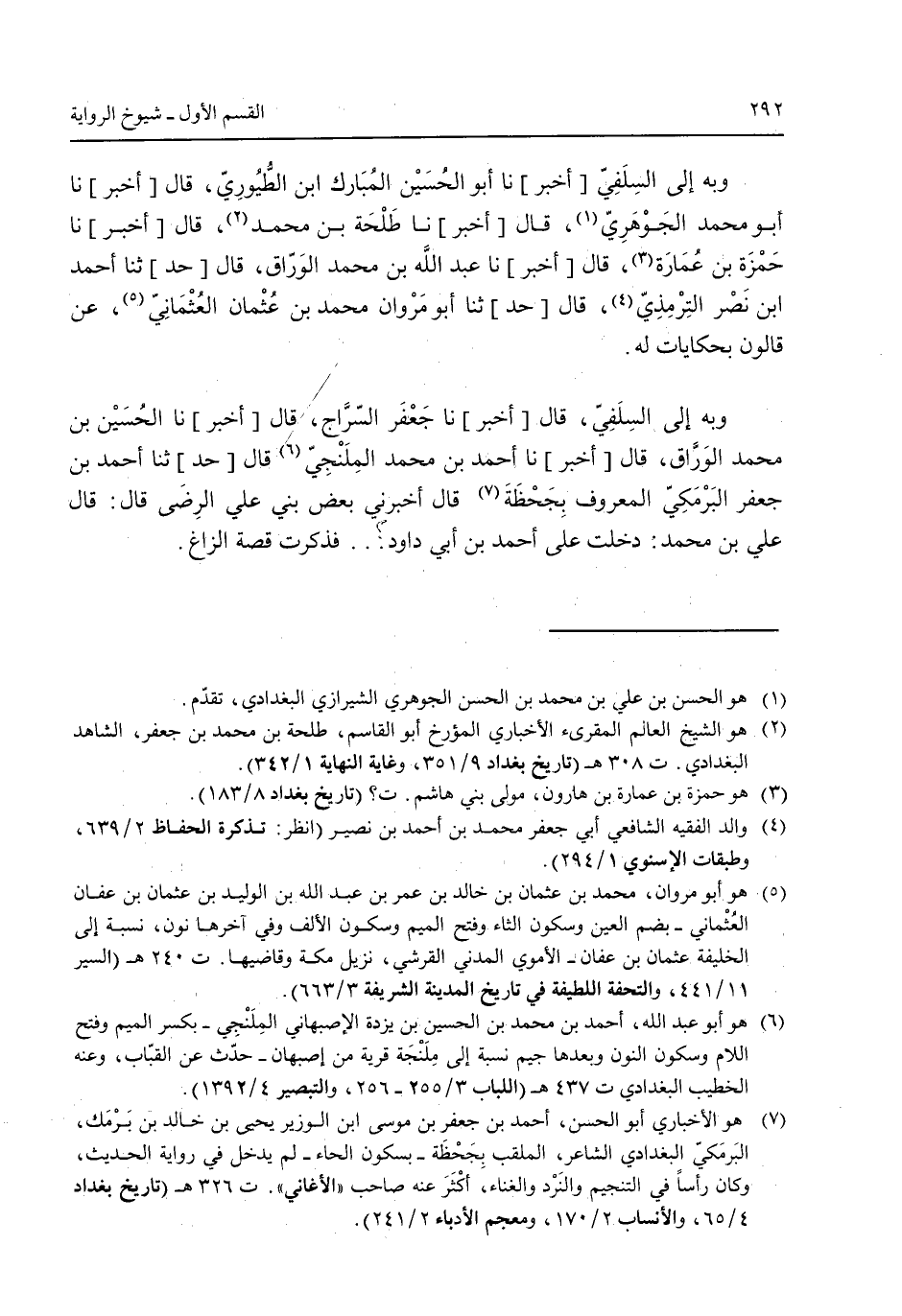 وبه إلى السلفي [أخبر] نا أبو لحسين المبارك ابن الطيوري قال [أخبر] نا أبو محمد الجوهري قال [أخبر] نا طلحة بن محمد قال [أخبر] نا حمزة بن عمارة قال [أخبر] نا عبد الله بن محمد الوراق قال [حد] ثنا أحمد ابن نصر الترمذي قال [حد] ثنا أبو مروان محمد بن عثمان العثماني ن قالون بحكايات له. وبه إلى السلفي قال [أخبر] نا جعفر السراج قال [أخبر] نا الحسين بن محمد الوراق قال [أخبر] نا أحمد بن محمد الملنجي قال [حد] ثنا أحمد بن جعفر البرمكي المعروف بجحظة قال أخبرني بعض بني علي الرضي قال: قال علي بن محمد: دخلت على أحمد بن أبي داود .. فذكرت قصة الزاغ.