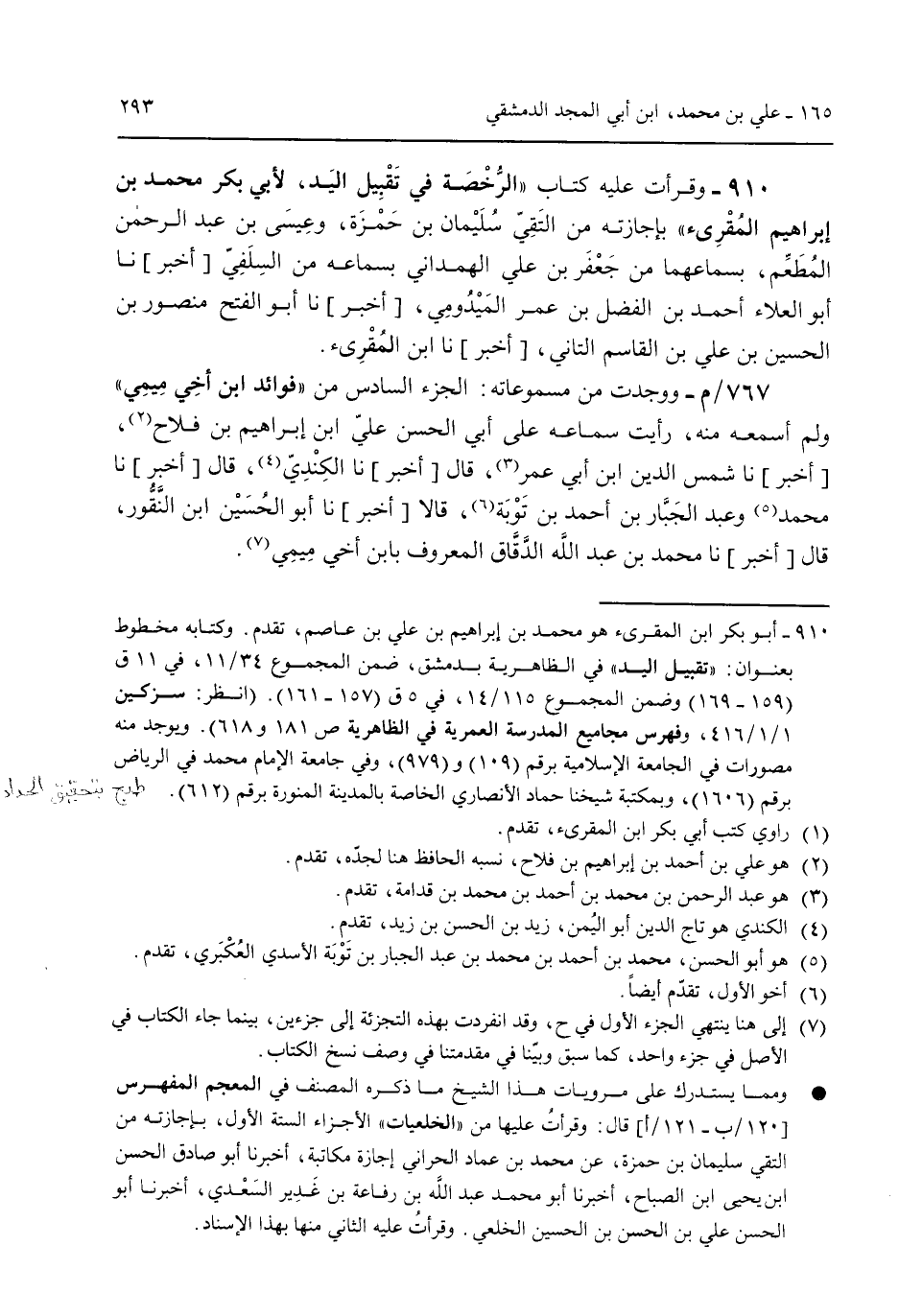 910 - وقرأت عليه كتاب "الرخصة في تقبيل اليد لأبي بكر محمد بن إبراهيم المُقرئ" بإجازته من التقي سليمان بن حمزة وعيسى بن عبد الرحمن المطعم بسماعهما من جعفر بن علي الهمداني بسماعه من السلفي [أخبر] نا أبو العلاء أحمد بن الفضل بن عمر الميدومي [أخبر] نا أبو الفتح منصور بن الحسين بن علي بن القاسم التاني [أخبر] نا ابن المقرئ. 767/م- ووجدت من مسموعاته: الجزء السادس من "فوائد ابن أخي ميمي" ولم أسمعه منه رأيت سماعه على أبي الحسن علي ابن إبراهيم بن فلاح [أخبر] نا شمس الدين ابن أبي عمر قال [أخبر] نا الكندي قال [أخبر] نا محمد وعبد الجبار بن أحمد بن توبة قالا [أخبر] نا أبو الحسين ابن النقور قال [أخبر] نا محمد بن علد الله الدقاق المعروف بابن أخي ميمي.