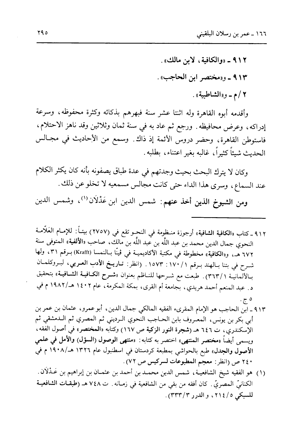 912 - "والكافية لابن مالك". 913 - و"مختصر ابن الحاجب". 2/م- و"الشاطبية". وأقدمة أبوه القاهرة وله اثنتا عشر سنة فبهرهم بذكائه وكثرة محفظه وسرعة إدراكه وعرض محافظيه. ورجع ثم عاد به في سنة ثمان وثلاثين وقد ناهز الاحتلام فاستوطن القاهرة وحضر دروس الأئمة إذ ذاك. وسمع من الأحاديث في مجالس الحديث شيئاً كثيراً غاليه بغير اعتناء بطلبه. وكان لا يترك البحث بحيث وجدتهم في عدة طباق يصفونة بأنه كان يكثير الكلام عند السماع وسرى هذا الداء حتى كانت مجالس مسمعيه لا لو عن ذلك. ومن الشيوخ الذين أخذ عنهم: شمس الدين ابن دلان وشمس الدين