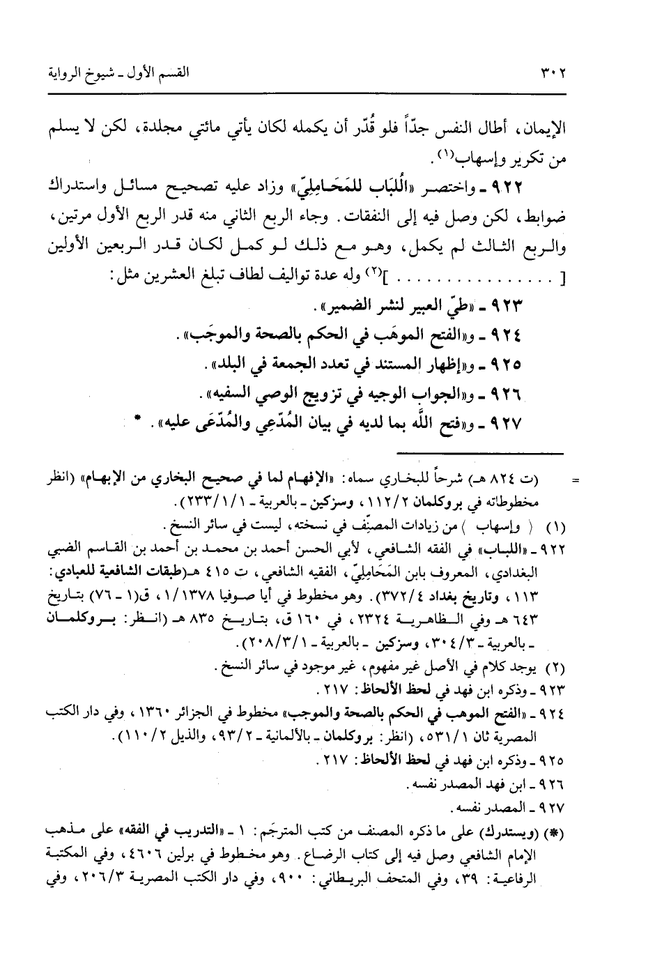 الإيمان أطال النفس جداً فلو قُدر أن يكمله لكان ياتي مائتي مجلدة لكن لا يسلم من تكرير وإسهاب. 922 - واختصر "اللباب المحاملي" وزاد عليه تصحيح مسائل واستدراك ضوابط لكن وصل فيه إلى النفقات. وجاء الربع الثاني منه قدر الربع الأول مرتين والربع الثالث لم يكمل وهو مذ لك لو كمل لكان قدر الربعين الأولين [ ........... ] وله عدة تواليف لطاف تبلغ العشرين مثل: 923 - "طي العبير لنشر الضمير". 924 - و"الفتح الموهب في الحكم بالصحة والموجب". 925 - و"إظهار المستند في تعدد الجمعة في البلد". 926 - و"الجواب الوجيه فى تزويج الوصي السفيه". 927 - و"فتح الله بنا لديه في بيان المُدَعِي والمُدعَى عليه".