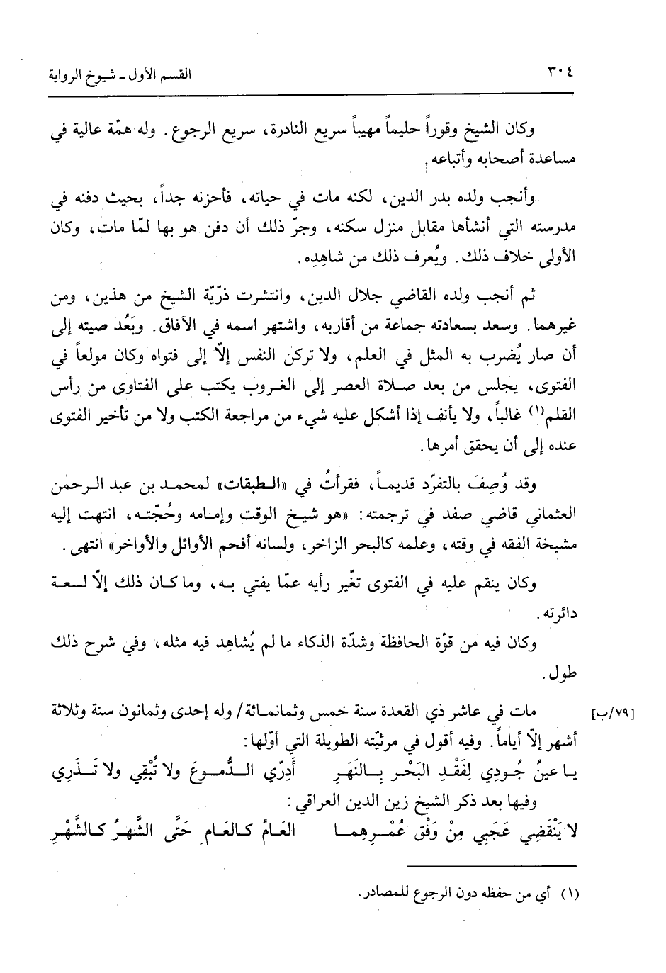 وكان الشيخ وقوراً حليماً مهيباً سريع النادرة سريع الرجوع. وله همة عالية في مساعدة أصحابة وأتباعه. وأنجب ولده وأنجب بدر الدين لكنه مات في حياته فأحزنه جداً بحيث دفنه في مدرسته التي أنشأها مقابل منزل سكنه وجر ذلك أن دفن هو بها لما مات وكان الأولى خلاف ذلك ويُعرف ذلك من شاهده. ثم أنجب ولده القاضي جلال الدين وانتشرت ذرية الشيخ من هذين ومن غيرهما. وسعد بسعادته جماعة من أقاربه واشتهر اسمه فى الآفاق. وبعد صيته إلى أن صار يُضرب به المقل في العلم ولا تركن النفس إلا إلى فتواه وكان مولعاً في الفتوى يجلس من بعد صلاة العصر إلى الغروب يكتب على الفتاوى من رأس القلم غالباً ولا يأنف إذا أشكل عليه شيء من مراجعة الكتب ولا من تأخير الفتوي عنده إلى أن يحقق أمرها. وقد وصف بالتفرد قديماً فقرأت في "الطبقات" لمحمد بن عبد الرحمن العثماني قاضي صفد في ترجمته: "هو شيخ الوقت وإمامه وحُجته انتهت إليه مشيخة الفقه في وقته وعلمه كالبحر الزاخر ولسانه أفحم الأوائل والأواخر" انتهى. وكان ينقم عليه في الفتوى تغير رأيه عما يفتي به وما كان ذلك إلا لسعة دائرته. وكان فيه من قوة الحافظة وشدة الذكاء ما لم يشاهد فيه مثله وفي شرح ذلك طول. مات في شهر ذي القعدة سنة خمس وثمانمائة وله إحدى وثمانون سنة وثلاثة أشهر إلا أياماً. وفيه أقول في مرثيته الطويلة التي أولها: يا عين جودي لفقد البحر بالنهر أدري الدموع ولا تبقي ولا تذري وفيها بعد ذكر الشيخ زين الدين العراقي: لا ينقضي عجبي من وفق عمرهما العام كالعام حتى الشهر كالشهر