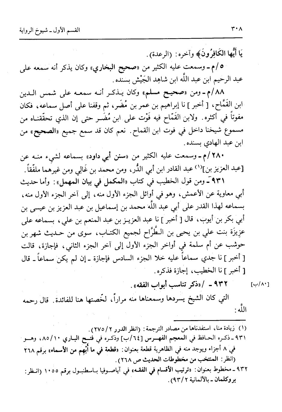 يأيها الكافرون} وآخره: (الرعدة). 5/م- وسمعت عليه الكثير من "صحيح البخاري" وكان يذكر أنه سمعه على عبد الرحيم ابن عبد الله ابن شاهد الجيش بسنده. 88/م- ومن "صحيح مسلم" وكان يذكر أنه سمعه على شمس الدين ابن القما قال [أخبر] نا إبراهيم بن عمر بن مُضر ثم وقفنا على أصل سماعه فكان مفوتاً في أكثره. ولابن القماخ فيه فوت على ابن مُضر حتى إن الذي تحققناه من مسموع شيخنا داخل في فوت ابن القماح. نعم كان قد سمع جميع "الصحيح" من ابن عبد الهادي بسنده" 280/م- وسمعت عليه الكثير من "سنن أبي داود" بسماعه لشيء منه عن عبد العزيز بن عبد القادر ابن أبي الدر ومن محمد بن غالي ومن غيرهما ملفقاً 931 - ومن قول الخطيب في كتاب "المكمل في بيان المهمل": وامال حديث أبي معاويه عن الأعمش وهو في أوائل الجزء الأول منه إلى آخر الجزء الأول منه بسماعه لهذا القدر على أبي عبد الله محمد بن إسماعيل بن عبد العزيز بن عيسى بن أبي بكر بن أيوب قال [أخبر] نا عبد العزيز بن عبد المنعم بن علي بسماعه على عزيزة بنت علي بن يحيى بن الطراح لجميع الكتاب سوى من حديث شهر بن حوشب عن ام سلمة في أواخر الجزء الأول إلى آخر الجزء الثاني فإجازة قالت [أخبر] نا جدي سماعاً عليه خلا الجزء السادس فإجازة -إن لم سكن سماعاً- قال [أخبر] نا الخطيب إجازة فذكره. 932 - "ذكر تناسب أبواب الفقه". التي كان الشيخ يسردها وسمعناها منه مراراً لخصتها هنا للفائدة. قال رحمه الله: