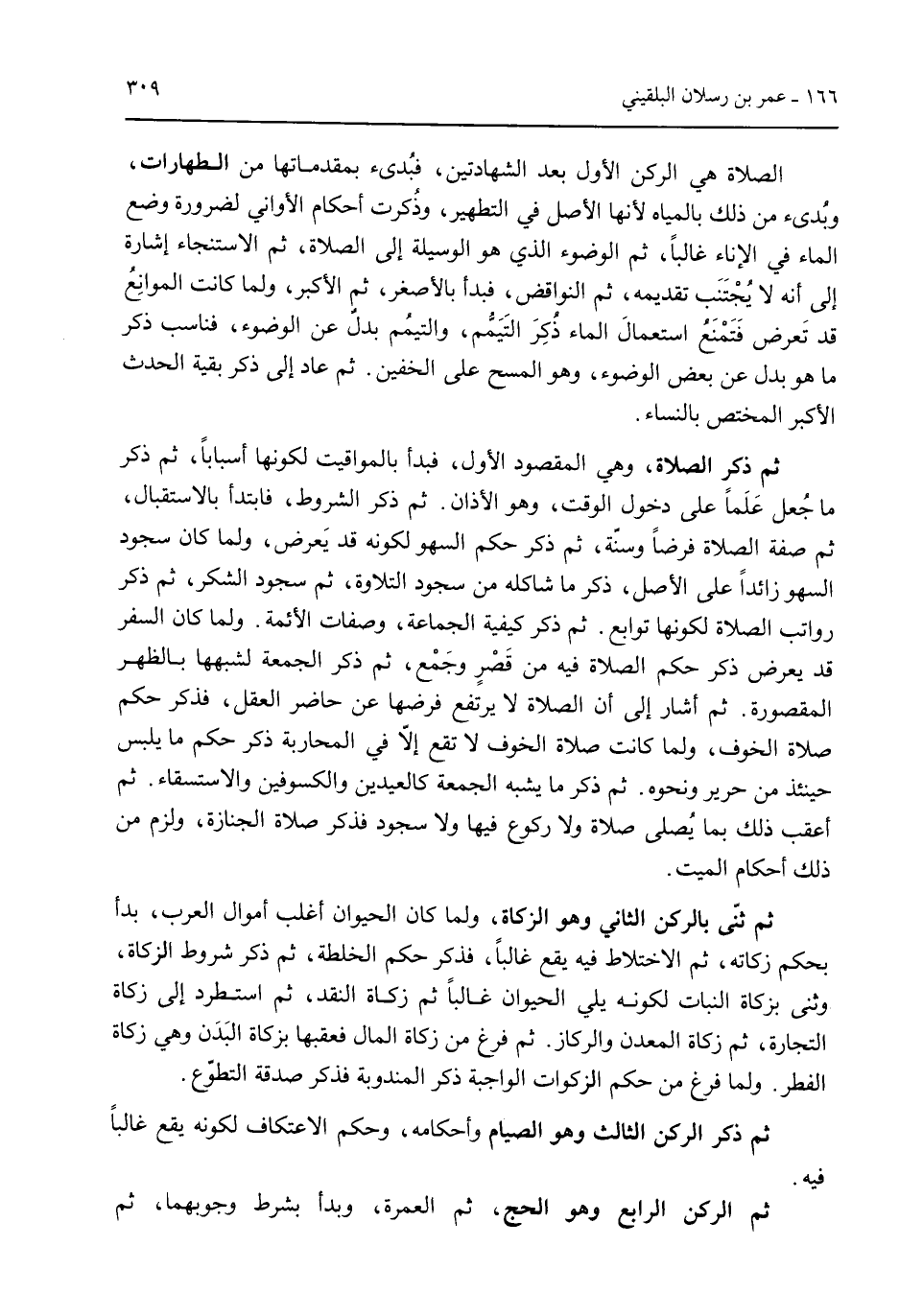 الصلاة هي الركن الأول بعد الشهادتين فبدئ بمقدماتها من الطهارات وبُدئ من ذلك بالمياه لأنها الأصل في التطهير وذكرت أحطام الأواني لصرورة وضع الماء فى الإناء غالباً ثم الوضوء الذي هو الوسيلة إلى الصلاة ثم الاستنجاء إسارة إلى أنه لا يُجتنب تقديمه ثن النواقض فبدأ بالأصغر قم الأكبر ولما كانت الموانع قد تعرض فتنمع استعمال الماء ذُكر التميم والتميم بدل عن الوضوء فناسب ذكر ماهو بدل عن بعض الوضوء وهو المسح على الخفين. ثم عاد إلى ذكر بقية الحدث الأكبر المختص بالنساء. ثم ذكر الصلاة وهو المقصود الأول فبدأ بالمواقيت لكونها سبباً ثم ذكر ما جعل علماص على دخول الوقت وهو الأذان. ثم ذكر الشروط فابتدأ بالاستقبال ثم صفة الصلاة فرضاً وسنة ثم ذكر حكم السهور لكونة قد يعرض ولما كان سجود السهور زائداً على الأصل ذكر ما شاكله من سجود التلاوة قم سجود الشكر ثم ذكر رواتب الصلاة لكونها توابع. ثم ذكر كيفية الجماعة وصفات الأئمة. ولكا كان السفر قد يعرض ذكر حكم الصلاة فيه من فصر وجمع ثم ذكر الجمعة لشبهها بالظهر المصورة. ثم أشار إلى أن الصلاة لا يرتفع فرشها عن حاضر العقل فذكر حكم صلاة الخوف ولما كانت صلاة الخوف لا تقع إلا في المحارية ذكر حكم ما يلبس حينئذ من حرير ونحوه. ثم ذكر ما يشبه الجمعة كالعيدين والكسوفين والاستسقاء. ثم أعقب ذلك بما يُصلي صلاة ولا ركوع فيها ولا سجود فذكر صلاة الجنازة ولزم من ذلك أحكام الميت. ثم ثنى بالركن الثاني وهو الزكاة ولما كان الحيوان أغلب أموال العرب بدأ بحكم زكاته ثم الاختلاط فيه يقع غالباً فذكر حكم الخلطة ثم ذكر شروط الزكاة وثنى بزكاة النبات لكونه يلي الحيوان غالباً قم زكاة النقد ثم استطرد إلى زماة التجارة ثم زكاة المعدن والركاز. ثم فرغ من زكاة المال فعقبها بزكاة البدن وهي زكاة الفطر. ولما فرغ من حكم الزكوات الواجبة ذكر المندوبة فذكر صدقة التطوه. ثم ذكر الركن الثالث وهو الصيام وأحكامه وحكم الاعتكاف لكونع يقع غالباً فيه. ثم الركن الرابع وهو الحج ثم العمرة وبدأ بشرط وجوبهما ثم