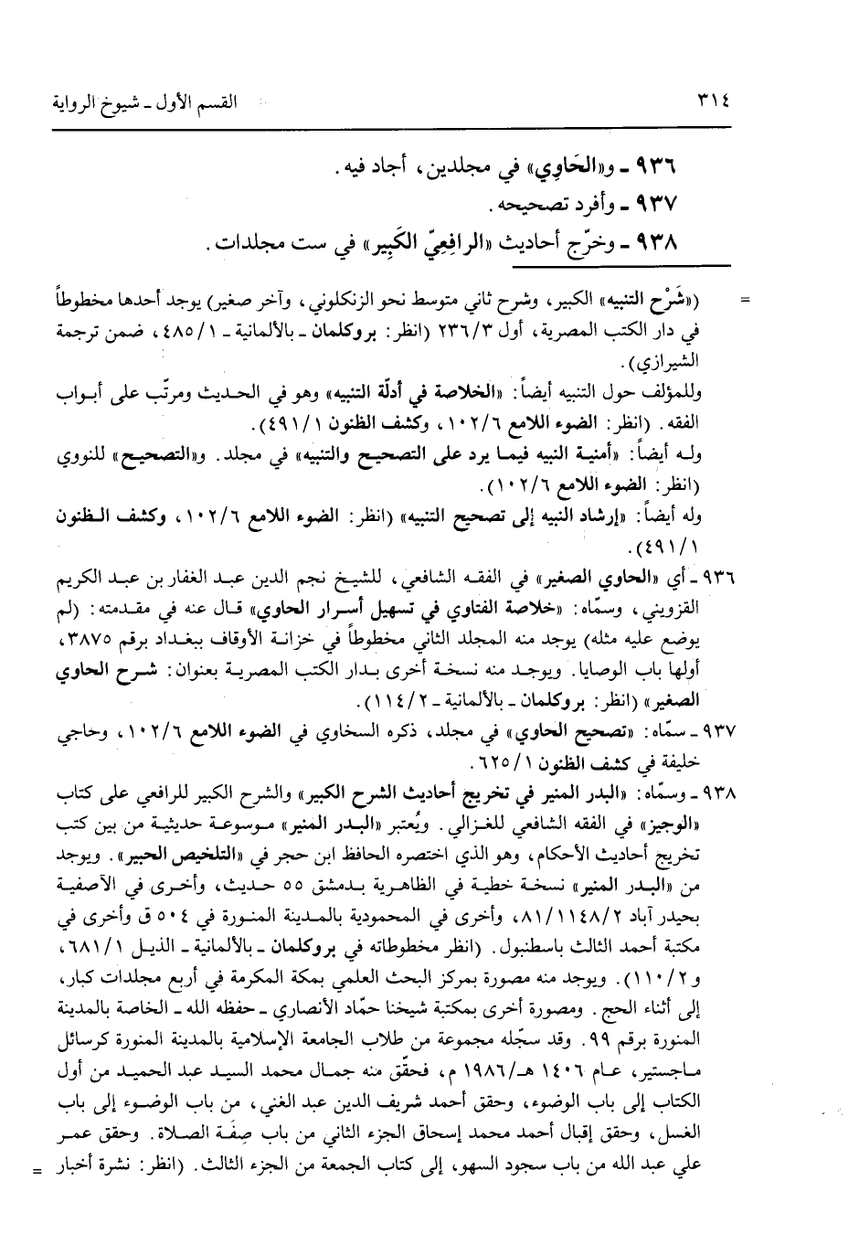 936 - و"الحاوي" في مجلدين أجاد فيه. 937 - وأفرد تصحيحه. 938 - وخرج أحاديث "الرافعي الكبير" في ست مجلدات.