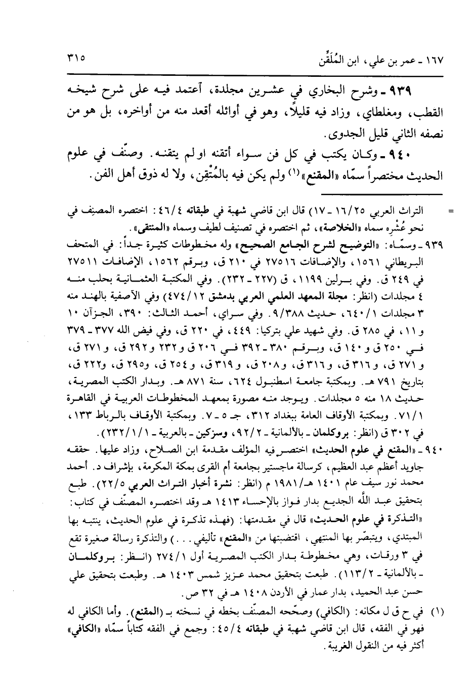 939 - وشرح البخاري في عشرين مجلدة أعتمد فيه على شرح شيخه القطب ومغلطاي وزاد فيه قليلاً وهو في أوائله أقعد منه من أواخره بل هو من نصفه الثاني قليل الجدوي. 940 - وكان يكتب في كل فن سواء أتقنه او لم يتقنه. وصنف في علوم الحديث مختصراً سماه "المقنع" ولم يكن فيه بالمُتقن ولا له أهل الفن.