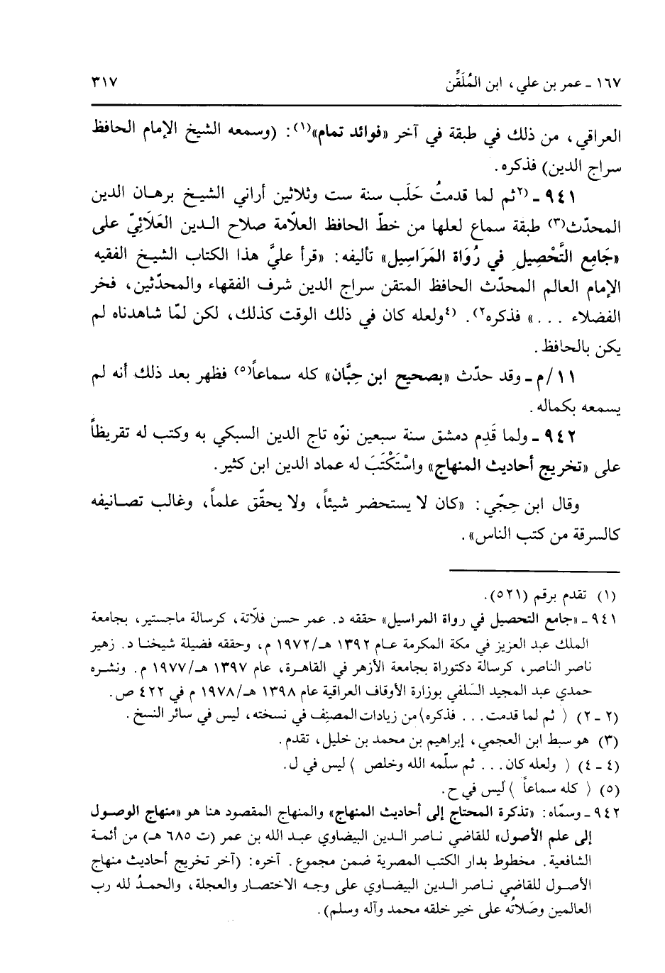 العراقي، من ذلك في طبقة في آخر "فوائد تمام" وسمعه الشيخ الإمام الحافظ سراج الدين فذكره 941 - ثم لما قدمت حلب سنة ست وثلاثين أراني الشيخ برهان الدين المحدث طبقة سماع لعلها من خط الحافظ العلامة صلاح الدين العلائي على "جامع التحصيل في رواة المراسيل" تأليفه: "قرأ علي هذا الكتاب الشيخ الفقيه الإمام العالم المحدث الحافظ المتقن سراج الدين شرف الفقهاء والحدثين فخر الفضلاء ... " فذكره. ولعله كان في ذلك الوقت كذلك لكن لما شاهدناه لم يكن بالحافظ. 11/م- وقد حدث "بصحيح ابن حبان" كله سماعاً فظهر بعد ذلك أنه لم يسمعه بكماله. 942 - ولما قدم دمشق سنة سبعين نوة تاج الدين السبكي به وكتب له تقريظاً على "تخريج أحاديث المنهاج" واستكتب له عماد الدين ابن كثير. وقال ابن حجي: "كان لا يستحضر شيئاً ولا يحقق علماً وغالب تصانيفه كالسرقة من كتب الناس".