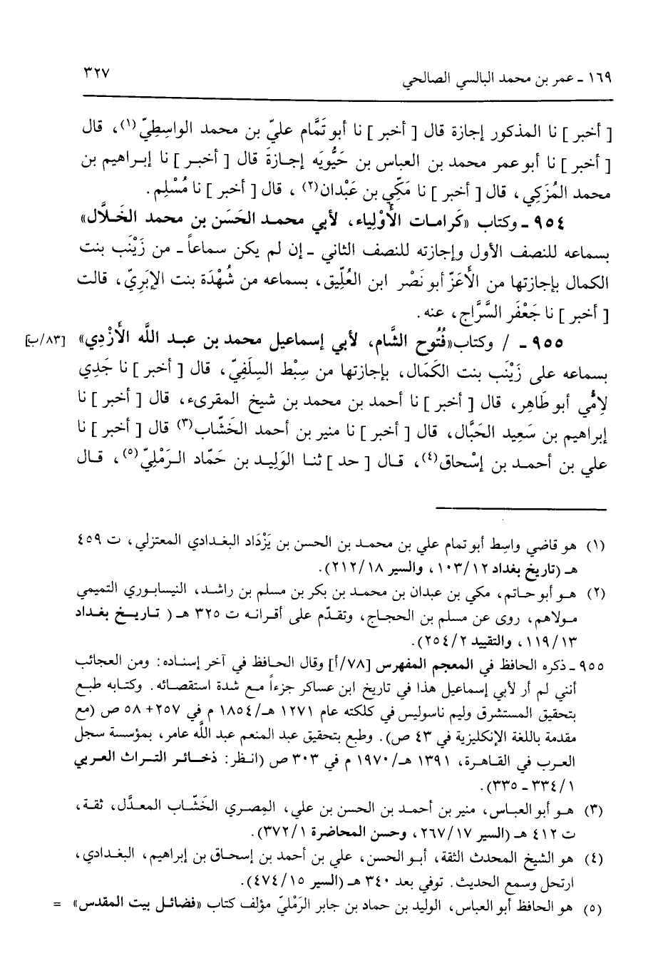 [أخبر] نا المذكور إجازة قال [أخبر] نا أبو تمام علي بن محمد الواسطي قال [أخبر] نا أبو عمر محمد بن العباس بن حيويه إجازة قال [أخبر] نا إبراهيم بن محمد المُزكي قال [أخبر] نا مكي بن عبدان قال [أخبر] نا مسلم. 954 - وكتاب "كرامات الأولياء لأبي محمد الحسن بن محمد الخلال" بسماعه للنص الأول وإجازته للنصف الثاني -إن لم يكن سماعاً- من زينب بنت الكمال بإجازتها من الأعز أبو نصر ابن العُليق بسماعه من شهدة بنت الإبري قالت [أخبر] نا جعفر السراج عنه. 955 - وكتاب "فتوح الشام لأبي إسماعيل محمد بن عبد الله الأزدي" بسماعه على زينب بنت الكمال بإجازتها من سبط السلفي قال [أخبر] نا جدي لأمي أبو طاهر قال [أخبر] نا أحمد بن محمد بن شيخ المقرئ قال [أخبر] نا إبراهيم بن سعيد الحبال قال [أخبر] نا منير بن أحمد الخشاب قال [أخبر] نا علي بن أحمد بن إسحاق قال [حد] ثنا الوليد بن حماد الرملي قال