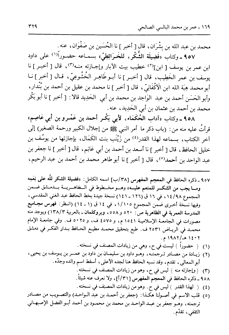 محمد بن عبد الله بن بشران قال [أخبر] نا الحسين بن صفوان عنه. 957 - وكتاب "فضيلة الشكر للخرائطي" بسماعه حضوراً على داود ابن عمر بن يوسف ابن خطيب بيت الآبار وإجازته منه قال [أخبر] نا يوسف بن عمر الخطيب قال [أخبر] نا أبو طاهر الخشوعي قال [أخبر] نا أبو محمد هبة الله ابن الأكفاني قال [أخبر] نا محمد بن عقيل بن أحمد بن بندار وأبو الحسن أحمد بن عبد الواحد بن محمد بن أبي الحديد قالا: [أخبر] نا أبو بكر محمد بن أحمد بن عثمان بن أبي الحديد عنه. 958 - وكتاب "آداب الحُكماء لأبي بكر أحمد بن عمرو بن أبي عاصم" قرأت عليه منه من: (باب ذكر النبي صلى الله عليه وسلم من إجلال الكبيرورحمة الصغير) إلى آخر الكتاب بسماعه لهذا القدر من زينب بنت الكمال بإجازتها من يوسف بن خليل الحافظ قال [أخبر] نا أسعد بن أحمد بن أبي غانم قال [أخبر] نا جعفر بن عبد الواحد بن أحمد قال [أخبر] نا أبو طاهر محمد بن أحمد بن عبد الرحيم