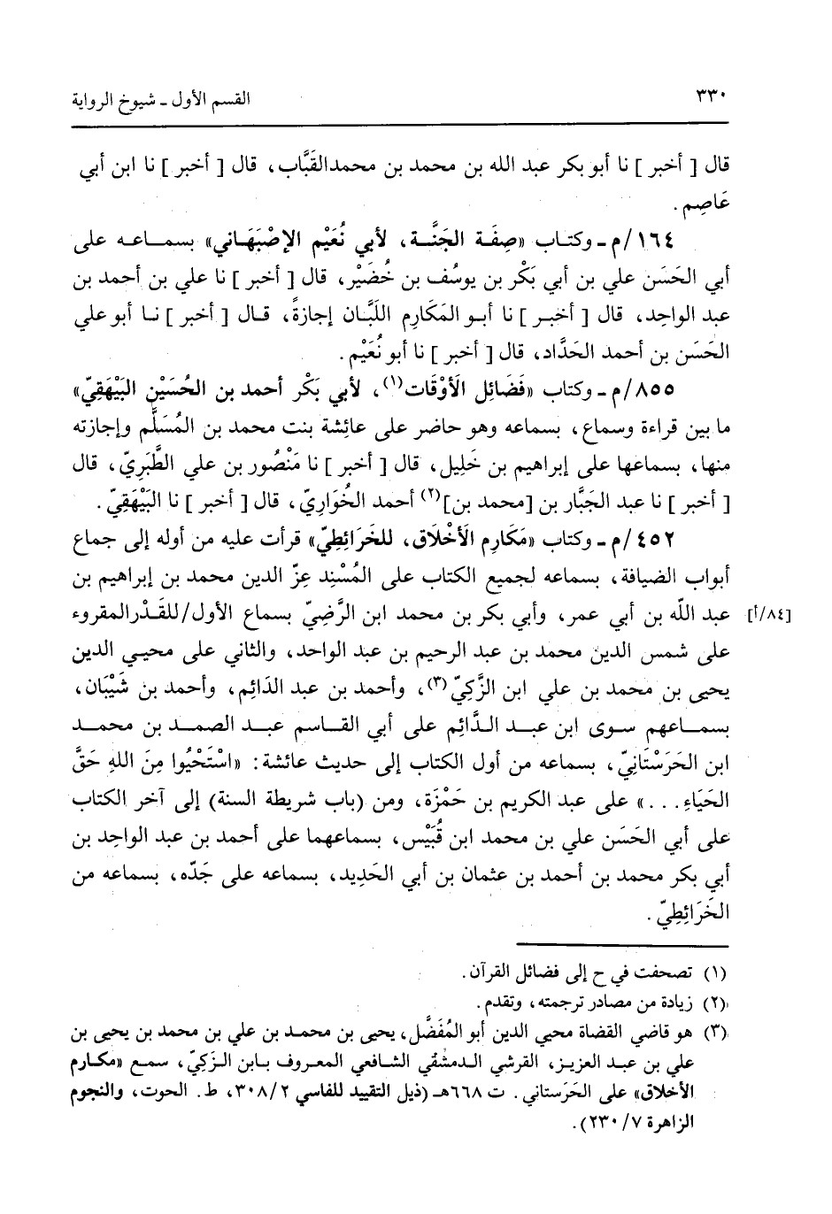 قال [أخبر] نا أبو بكر عبد الله بن محمد بن محمد القباب قال [أخبر] نا ابن أبي عاصم. 164/م- وكتاب "صفة الجنة لأبي نعيم الإصبهاني" بسماعه على أبي الحسن علي بن أبي بكر بن يوسف بن خُضير قال [أخبر] نا علي بن أحمد بن عبد الواحد قال [أخبر] نا أبو المكارم اللبان إجازة قال [أخبر] نا أبو علي الحسن بن أحمد الحداد قال [أخبر] نا أبو نعيم. 855/م- وكتاب "فضائل الأوقات لأبي بكر أحمد بن الحسين البيهقي" 452/م- وكتاب "مكارم الأخلاق للخرائطي" قرأت عليه من أوله إلى جماع أبواب الضايفة بسماعه لجميع الكتاب على المُسند عز الدين محمد بن إبراهيم بن عبد الله بن أبي عمر وأبي بكر بن محمد ابن الرضي بسماع الأول للقدر المقروء على شمس الدين محمد بن عبد الرحيم بن عبد الواحد والثاني على محيي الدين يحيى بن محمد بن علي ابن الزكي وأحمد بن عبد الدائم وأحمد بن شيبان بسماعهم سوى ابن عبد الدائم أبي القاسم عبد الصمد بن محمد ابن الحرستاني بسماعه من أول الكتاب إلى حديث عائشة: "استحيوا من الله حق الحياء ... " على عبد الكريم بن حمزة ومن باب (شريطة السنة) إلى آخر الكتاب على أبي الحسن علي بن محمد بن قبيس بسماعهما على أحمد بن عبد الواحد بن أبي بكر محمد بن أحمد بن عثمان بن أبي الحديد بسماعه على جده بسماعه من الخرائطي.