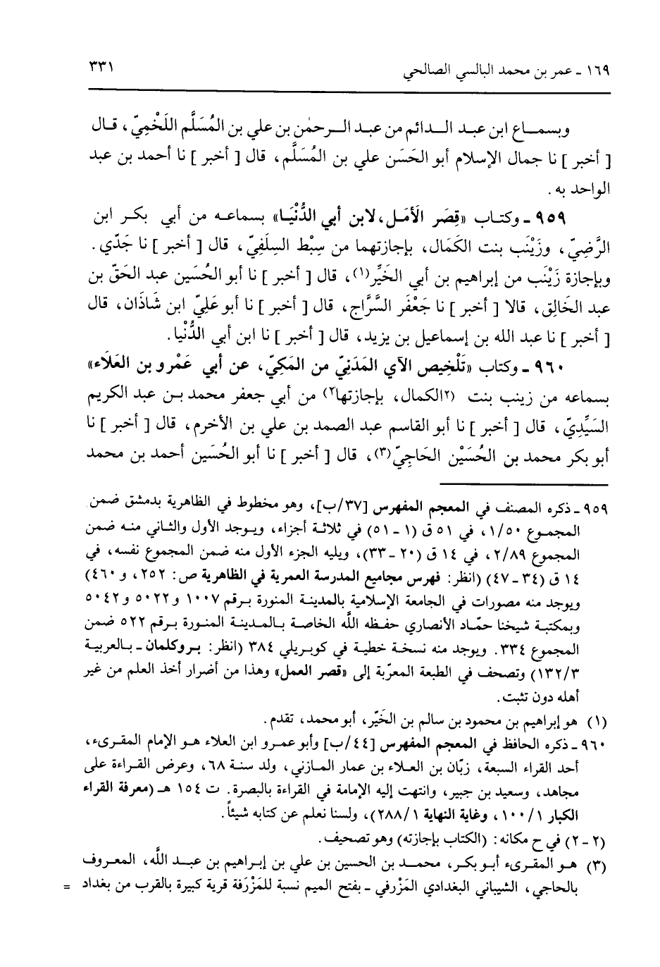 وبسماع ابن عبد الدائم من عبد الرحمن بن علي بن المسلم اللخمي قال [أخبر] نا جمال الإسلام أبو الحسن علي بن المسلم قال [أخبر] نا أحمد بن عبد الواحد به. 959 - وكتاب "قصر الأمل لابن أبي الدنيا" بسماعه من أبي بكر ابن الرضي وزينب بنت الكمال بإجازتهما من سبط السلفي قال [أخبر] نا جدي وبإجازة زينب من إبراهيم بن أبي الخير قال [أخبر] نا أبو الحسين عبد الحق بن عبد الخالق قالا [أخبر] نا جعفر السراج قال [أخبر] نا أبو علي ابن شاذان قال [أخبر] نا عبد الله بن إسماعيل بن يزيد قال [أخبر] نا ابن أبي الدنيا. 960 - وكتاب "تلخيص الآي المدني من المكي عن أبي عمرو بن العلاء" بسماعه من زينب بنت الكمال بإجازتها من أبي جعفر محمد بن عبد الكريم السيدي قال [أخبر] نا أبو القاسم عبد الصمد بن علي بن الأخرم قال [أخبر] نا أبو بكر محمد بن الحسين الحاجي قال [أخبر] نا أبو الحسين أحمد بن محمد