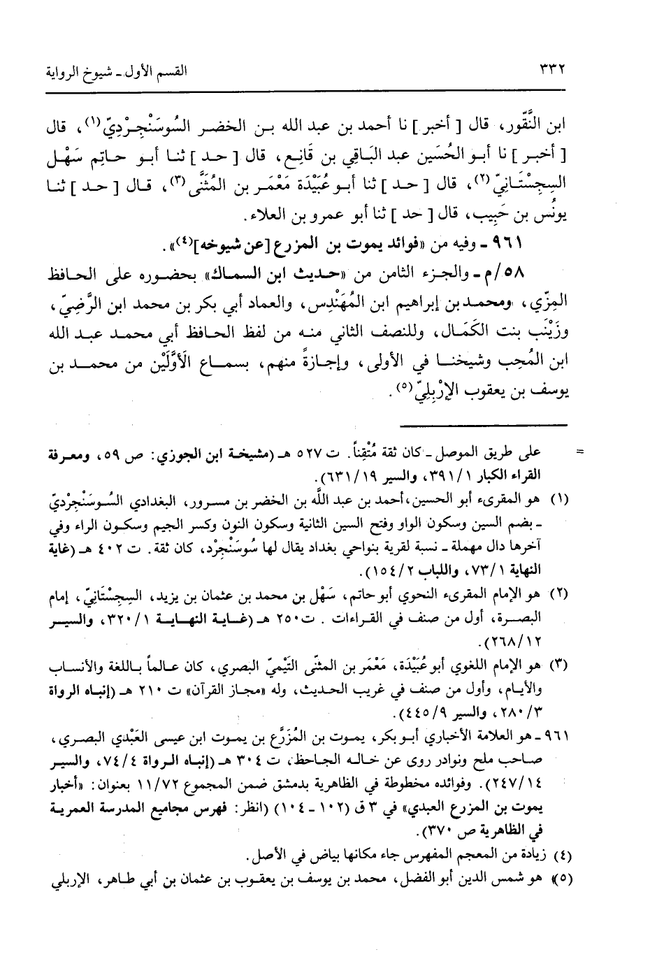 ابن النقور قال [أخبر] نا أحمد بن عبد الله بن الأخضر السوسنجردي قال [أخبر] نا أبو الحسين عبد الباقي بن قانع قال [حد] ثنا أبو حاتم سهل السجستاني قال [حد] ثنا أبو عبيدة معمر بن المثني قال [حد] ثنا يونس بن حبيب قال [حد] ثنا أبو عمرو بن العلاء. 961 - وفيه من "فوائد يموت بن المزرع عن شيوخه". 58/م- والجزء الثامن من "حديث ابن السماك" بحضوره على الحافظ المزي ومحمد بن إبراهيم بن المهندس والعماد أبي بكر بن محمد ابن الرضي وزينب بنت الكمال وللنصف الثاني منه من لفظ الحافظ أبي محمد عبد الله ابن المحب وشيخنا في الأول وإجازة منهم بسماع الأولين من محمد بن يوسف بن يعقوب الإربلي.