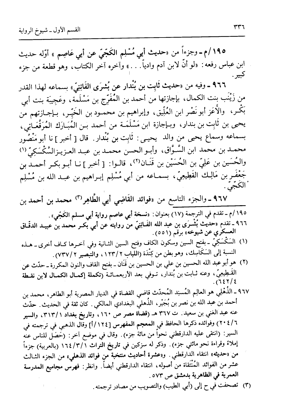 195/م- وجزءاً من "حديث أبي مسلم الكجي عن أبي عاصم" أوله حديث ابن عباس رفعه: "لو أن لابن آدم وادياً .. " وآخره آخر الكتاب وهو قطعة من جزء كبير. 966 - وفيه من "حديث ثابت بن بندار عن بشرى القاتني" بسماعه لهذا القدر من زينب بنت الكمال بإجازتها من أحمد بن المُفرج بن مسلمة وعجيبة بنت أبي بكر والأعز أبو نصر ابن العُليق وإبراهيم بن محمود بن الخير بإجازتهم من يحيى بن ثابت بن بندار وبإجازة ابن مسلمة من أحمد بن المبارك المُرقعاتي بسماعه وسماع يحيى من والد يحيى: ثابت بن بندار قال [أخبر] نا أبو منصور محمد بن محمد ابن السواص وأبو الحسن محمد بن عبد العزيز السكسكي والحسين بن علي بن الحسين بن قنان قالوا [أخبر] نا أبو بكر أحمد بن جعفر بن مالك القطيعي بسماعه من أبي مسلم إبراهيم بن عبد الله بن مسلم الكجي. 967 - والجزء التاسع من "فوائد القاضي أبي الطاهر محمد بن أحمد بن