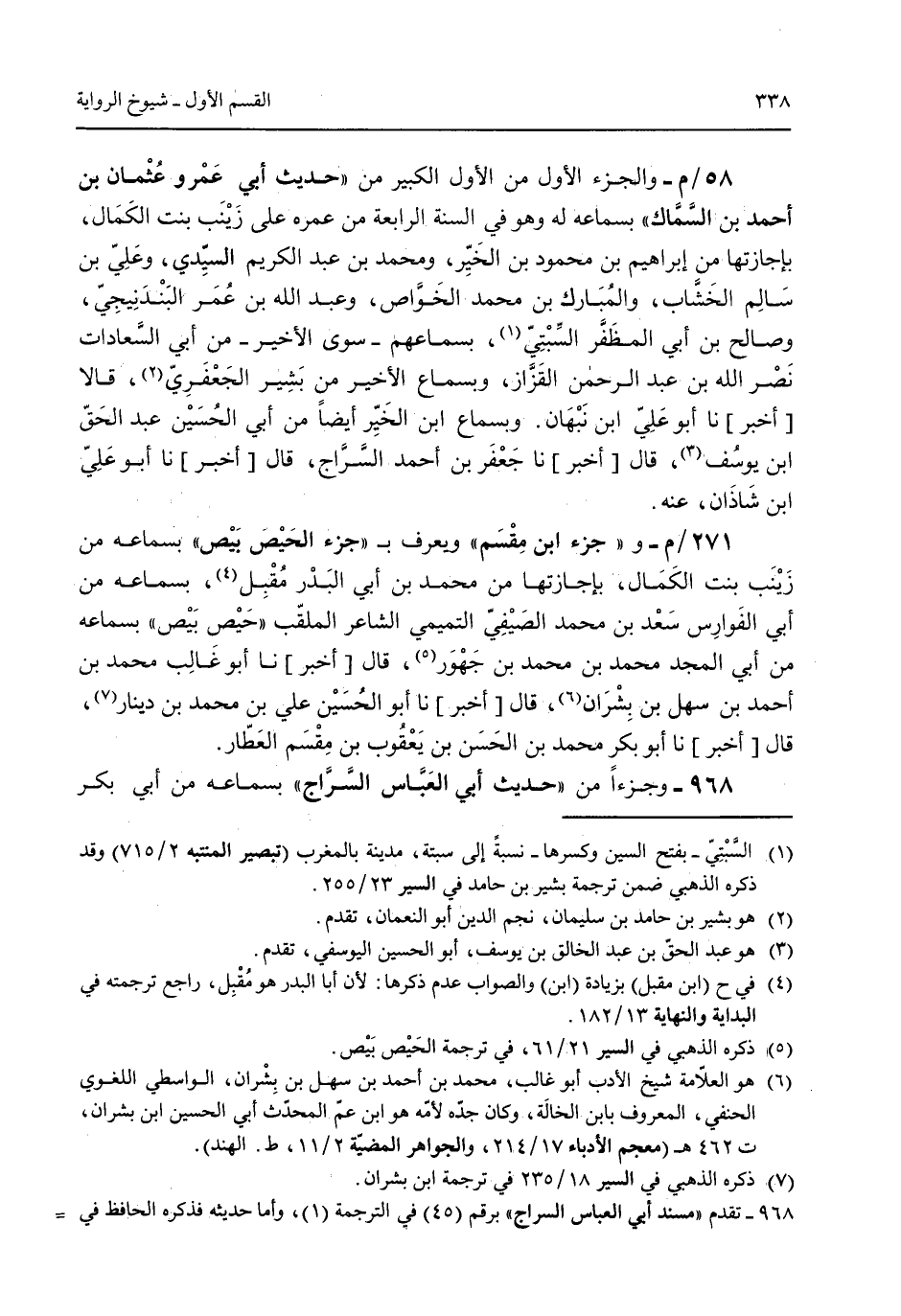 58/م- والجزء الأول من الأول الكبير من "حديث أبي عمرو عثمان بن أحمد ابن السماك" بسماعه له وهو في السنة الرابعة من عمره على زينب بنت الكمال بإجازتها من إبراهيم بن محمد بن الخير ومحمد بن عبد الكريم السيدي وعلي بن سالم الخشاب والمبارك بن محمد الخواص وعبد الله بن عُمر البندنيجي وصالح بن أبي المظفر السبتي بسماعهم -سوى الأخير- من أبي السعادات نصر الله بن عبد الرحمن القزاز وبسماع الأخيرى من بشير الجعفري قالا [أخبر] نا أبو علي ابن نبهان. وبسماع ابن الخير أيضاً من أبي الحسين عبد الحق ابن يوسف قال [أخبر] نا جعفر بن أحمد السراج قال [أخبر] نا أبو علي ابن شاذان عنه. 271/م- و"جزء ابن مقسم" ويعرف بـ "جزء الحيص بيص" بسماعه من زينب بنت الكمال بإجازتها من محمد بن أبي البدر مُقبل بسماعه من أبي الفوارس سعد بن محمد الصيفي التميمي الشاعر الملقب "حيص بيص" بسماعه من أبي المجد محمد بن محمد بن جهور قال [أخبر] نا أبو غالب محمد بن احمد بن سهل بن بشران قال [أخبر] نا أبو الحسين علي بن محمد بن دينار قال [أخبر] نا أبو بكر محمد بن الحسن بن يعقوب بن مقسم العطار. 968 - وجزءاً من "حديث أبي العباس السراج" بسماعه من أبي بكر