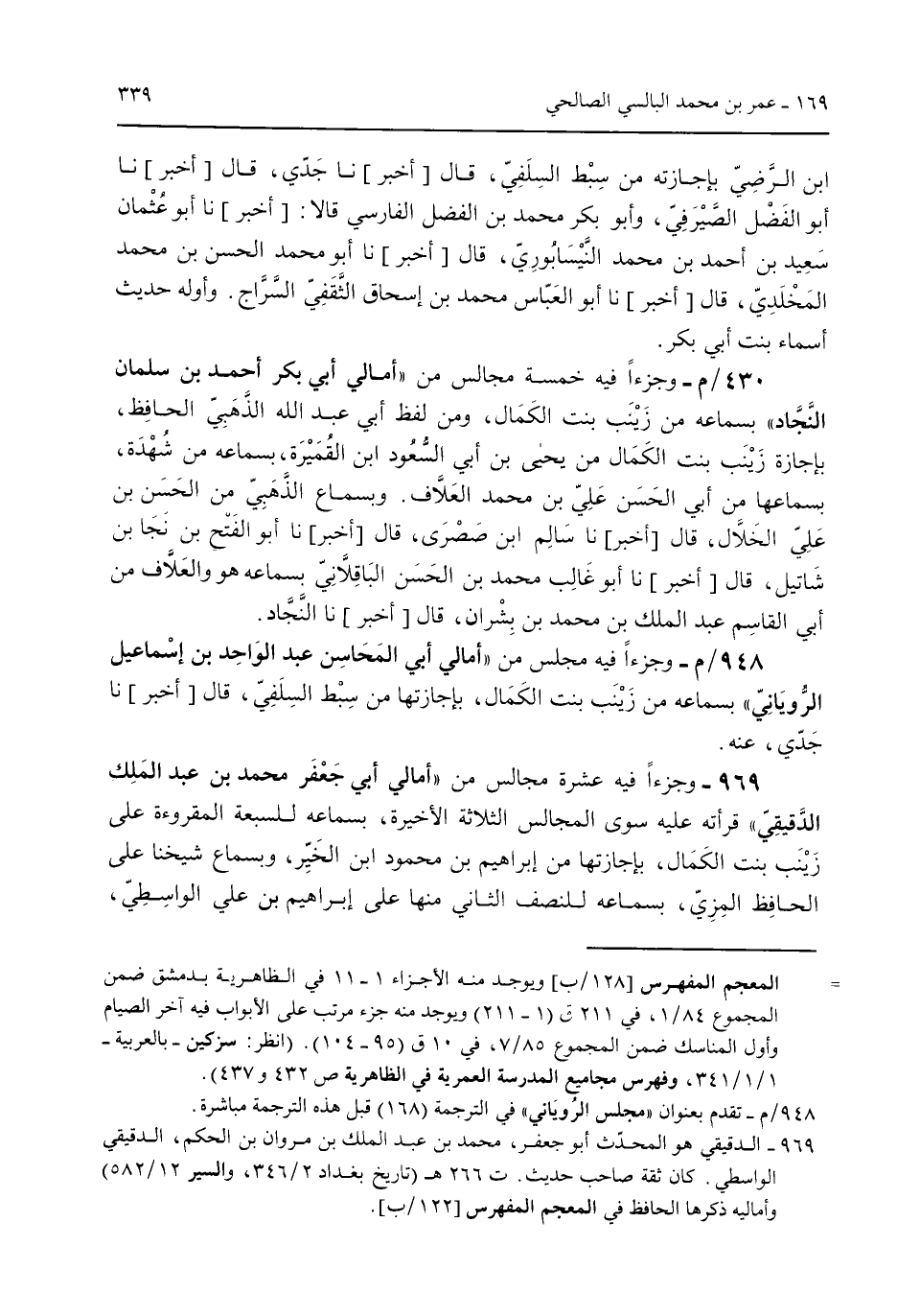 ابن الرضي بإجازته من سبط السلفي قال [أخبر] نا جدي قال [أخبر] نا أبو الفضل الصيرفي وأبو بكر محمد بن الفضل الفارسي قالا: [أخبر] نا أبو عثمان سعيد بن أحمد بن محمد النيسابوري قال [أخبر] نا أبو محمد الحسن بن محمد المخلدي قال [أخبر] نا أبو العباس محمد بن إسحاق الثقفي السراج. وأوله حديث أسماء بنت أبي بكر. 430/م- وجزءاً فيه خمسة مجالس من "أمالي أبي بكر أحمد بن سلمان النجاد" بسماعه من زينب بنت الكمال ومن لفظ أبي عبد الله الذهبي الحافظ بإجازة زينب بنت الكمال من يحيى بن أبي السعود ابن القُميرة بسماعه من شُهدة بسماعها من أبي الحسن علي بن محمد العلاف. وبسماع الذهبي من الحسن بن علي الخلال قال [أخبر] نا سالم ابن صصرى قال [أخبر] نا أبو الفتح بن نجا بن شاتيل قال [أخبر] نا أبو غالب محمد بن الحسن الباقلاني بسماعه هو والعلاف من أبي القاسم عبد الملك بن محمد بن بشران قال [أخبر] نا النجاد. 984/م- وجزءاً فيه من "أمالي أبي المحاسن عبد الواحد بن إسماعيل الروياني" بسماعه من زينب بنت الكمال بإجازتها من سبطالسلفي قال [أخبر] نا جدي عنه. 969 - وجزءاً فيه عشرة مجالس من "أمالي أبي جعفر محمد بن عبد الملك الدقيقي" قرأته عليه سوى المجالس الثلاثة الأخيرة بسماعه للسبعة المقروءة على زينب بنت الكمال بإجازتها من إبراهيم بن محمد ابن الخير وبسماع شيخنا على الحافظ المزي بسماعه للنصف الثاني منها على إبراهيم بن علي الواسطي
