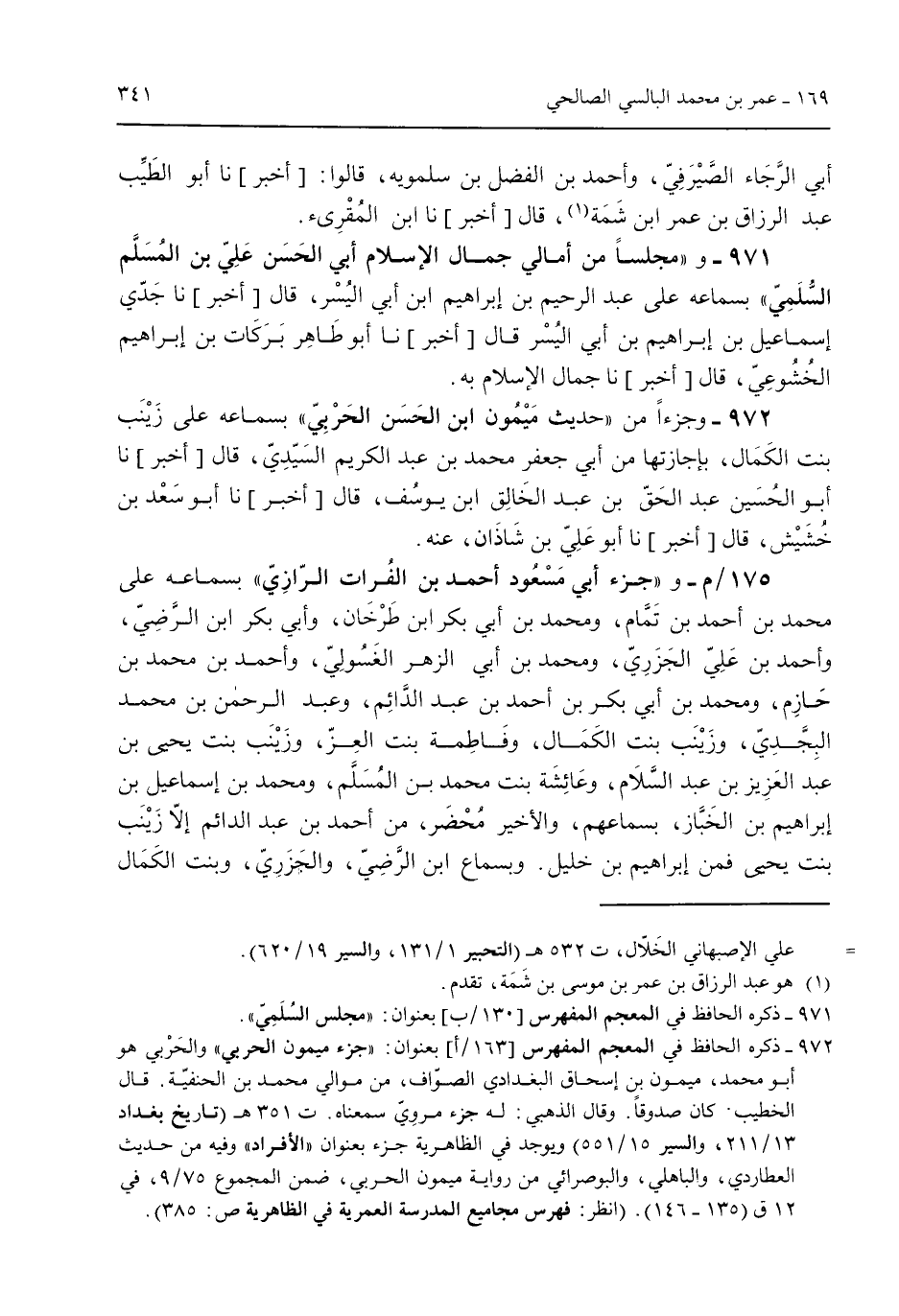 أبي الرجاء الصيرفي وأحمد بن الفضل بن سلموية قالوا: [أخبر] نا أبو الطيب عبد الرازق بن عمر ابن شمة قال [أخبر] نا ابن المقرئ. 971 - و"مجلساً من أمالي جمال الإسلام أبي الحسن علي بن بالمسلم السلمي" بسماعه على عبد الرحيم بن إبراهيم ابن أبي اليسر قال [أخبر] نا جدي إسماعيل بن إبراهيم بن أبي اليسر قال [أخبر] نا أبو طاهر بركات بن إبراهيم الخشوعي قال [أخبر] نا جمال الإسلام به. 972 - وجزءاً من "حديث ميمون ابن الحسن الحربي" بسماعه على زينب بنت الكمال بإجازتها من أبي جعفر محمد بن عبد الكريم السيدي قال [أخبر] نا أبو الحسين عبد الحق بن عبد الخالق بن يوسق قال [أخبر] نا أبو سعد بن خُشيش قال [أخبر] نا أبو علي بن شاذان عنه. 175/م- و"جزء أبي مسعود أحمد بن الفرات الرازي" بسماعه على محمد بن أحمد بن تمام ومحمد بن أبي بكر ابن طرخان وأبي بكر ابن الرضي وأحمد بن علي الجزري ومحمد بن أبي الزهر الغُسولي وأحمد بن محمد بن حازم ومحمد بن أبي بكر بن أحمد بن عبد الدائم وعبد الرحمن بن محمد البجدي وزينب بنت الكمال وفاطمة بنت العز وزينب بنت يحيى بن عبد العزيز بن عبد السلام وعائشة بنت محمد بن المسلم ومحمد بن إسماعيل بن إبراهيم بن الخباز بسماعهم والأخير مُحضر من أحمد بن عبد الدائم إلا زينب بنت يحيى فمن إبراهيم بن خليل. وبسماع ابن الرضي والجزري وبنت الكمال