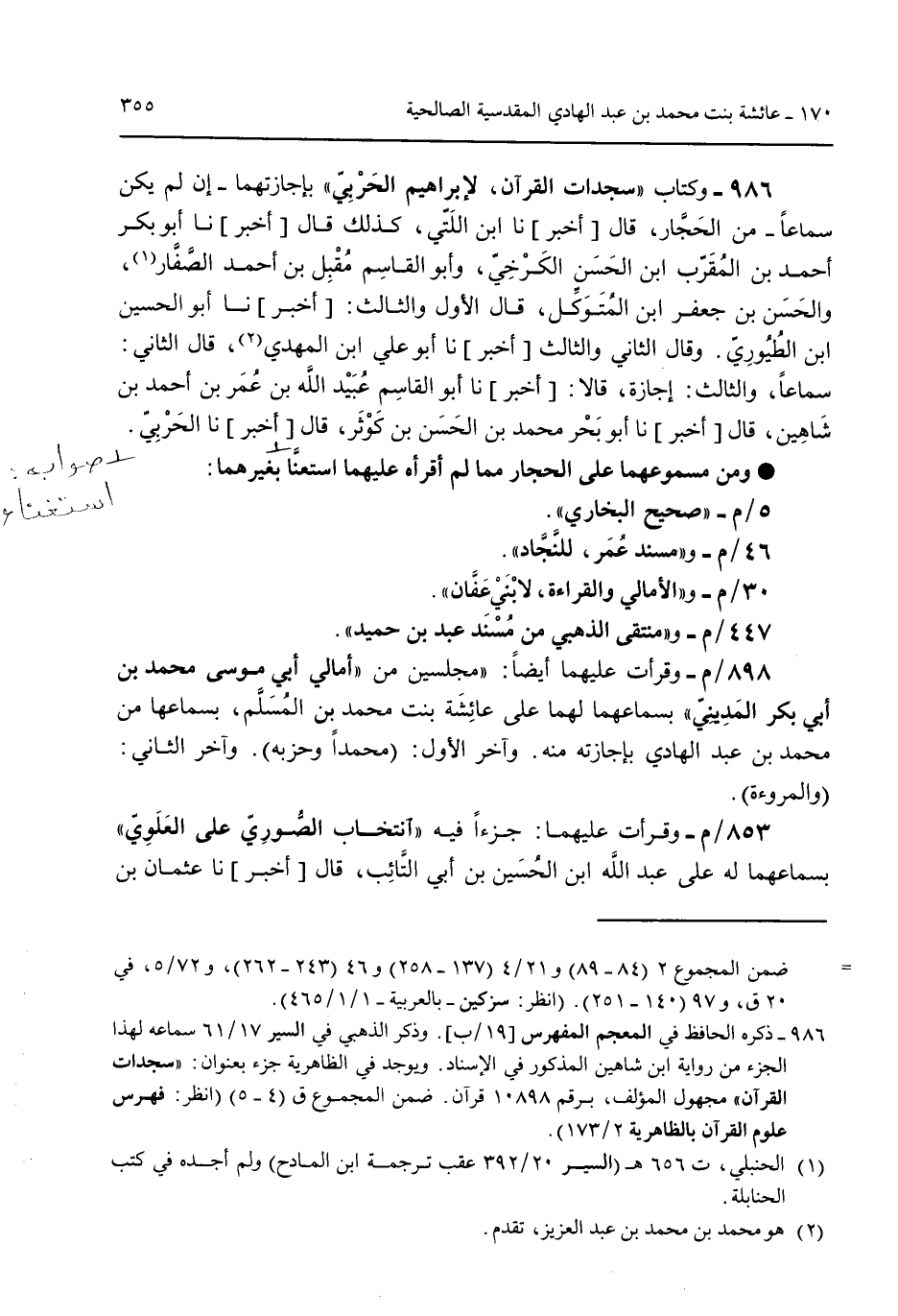 986 - وكتاب "سجدات القرآن لإبراهيم الحربي" بإجازتهما -إن لم يكن سماعاً- من الحجار قال [أخبر] نا ابن اللتي كذلك قال [أخبر] نا أبو بكر أحمد بن المقرب ابن الحسن الكرخي وأبو القاسم مُقبل بن أحمد الصفار والحسن بن جعفر ابن المتوكل قال الأول والثالث: [أخبر] نا أبو الحسين ابن الطُيُوري. وقال الثاني والثالث [أخبر] نا أبو علي ابن المهدي قال الثاني سماعاً والثالث: إجازة قالا [أخبر] نا أبو القاسم عبيد الله بن عمر بن أحمد بن شاهين قال [أخبر] نا أبو بحر محمد بن الحسن بن كوثر قال [أخبر] نا الحربي. ومن مسموعهما على الحجار مما لم اقرأه عليهما استعنا بغيرهما: 5/م- "صحيح البخاري". 46/م- و"مسند عُمر للنجاد". 30/م- و"الأمالي والقراءة لابني عفان". 447/م- و"منتقى الذهبي من مسند عبد بن حميد". 898/م- وقرأت عليهما أيضاً: "مجلسين من "أمالي أبي موسى بن محمد بن أبي بكر المديني" بسماعهما لهما على عائشة بنت محمد بن المسلم لسماعهما من محمد بن عبد الهادي بإجازته منه وآخر الأول: (محمداً وحزبه). وآخر الثاني: (والمروءة). 853/م- وقرأت عليهما: جزءاً فيه "انتخاب الصوري على العلوي" بسماعهما له على عبد الله ابن الحسين بن أبي التائب قال [أخبر] نا عثمان بن