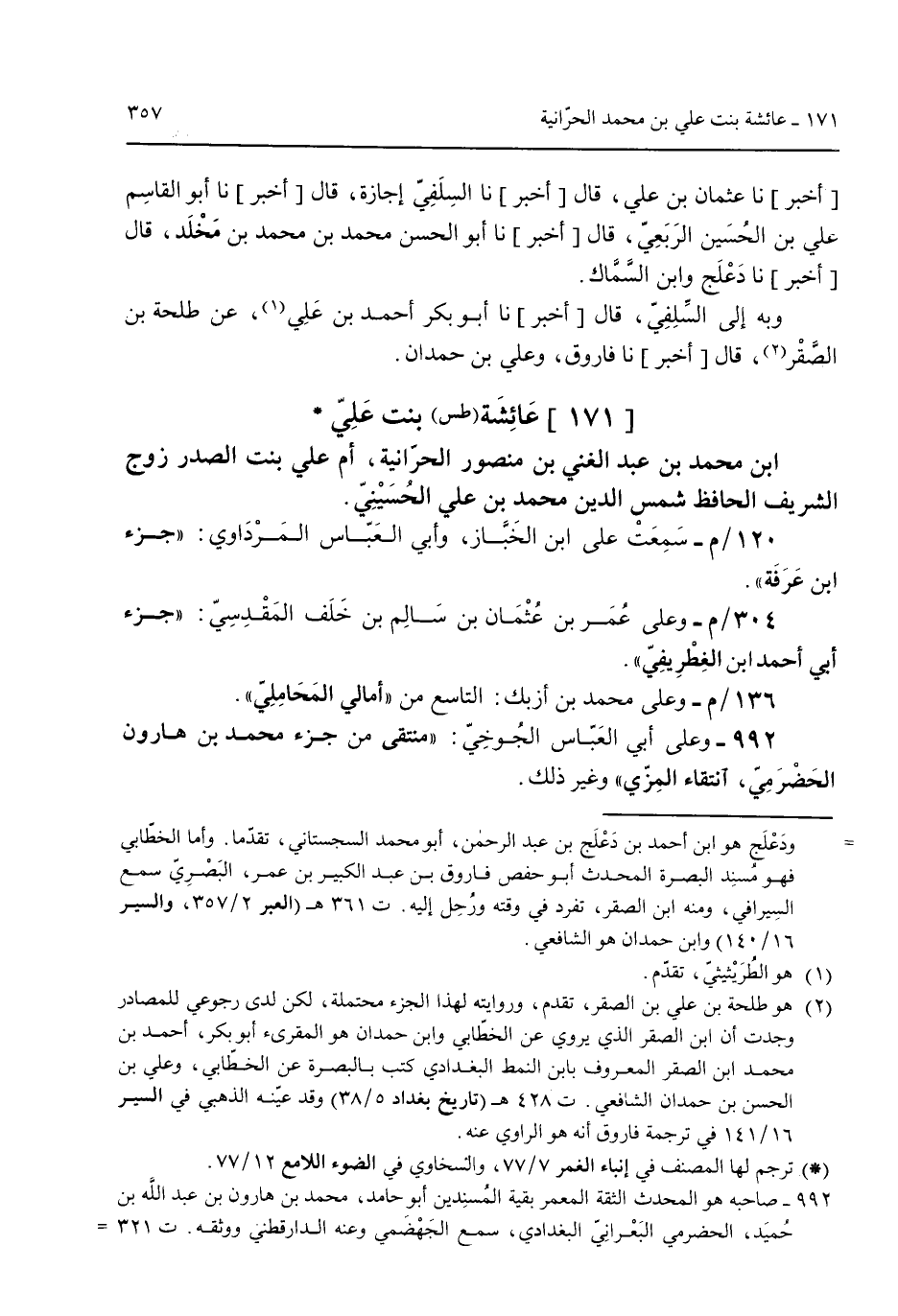 [171] عائشة (طس) بنت علي ابن محمد بن عبد الغني بن منصور الحرانية أم علي بنت الصدر زوج الشريف الحافظ شمس الدين محمد بن علي الحُسيني.