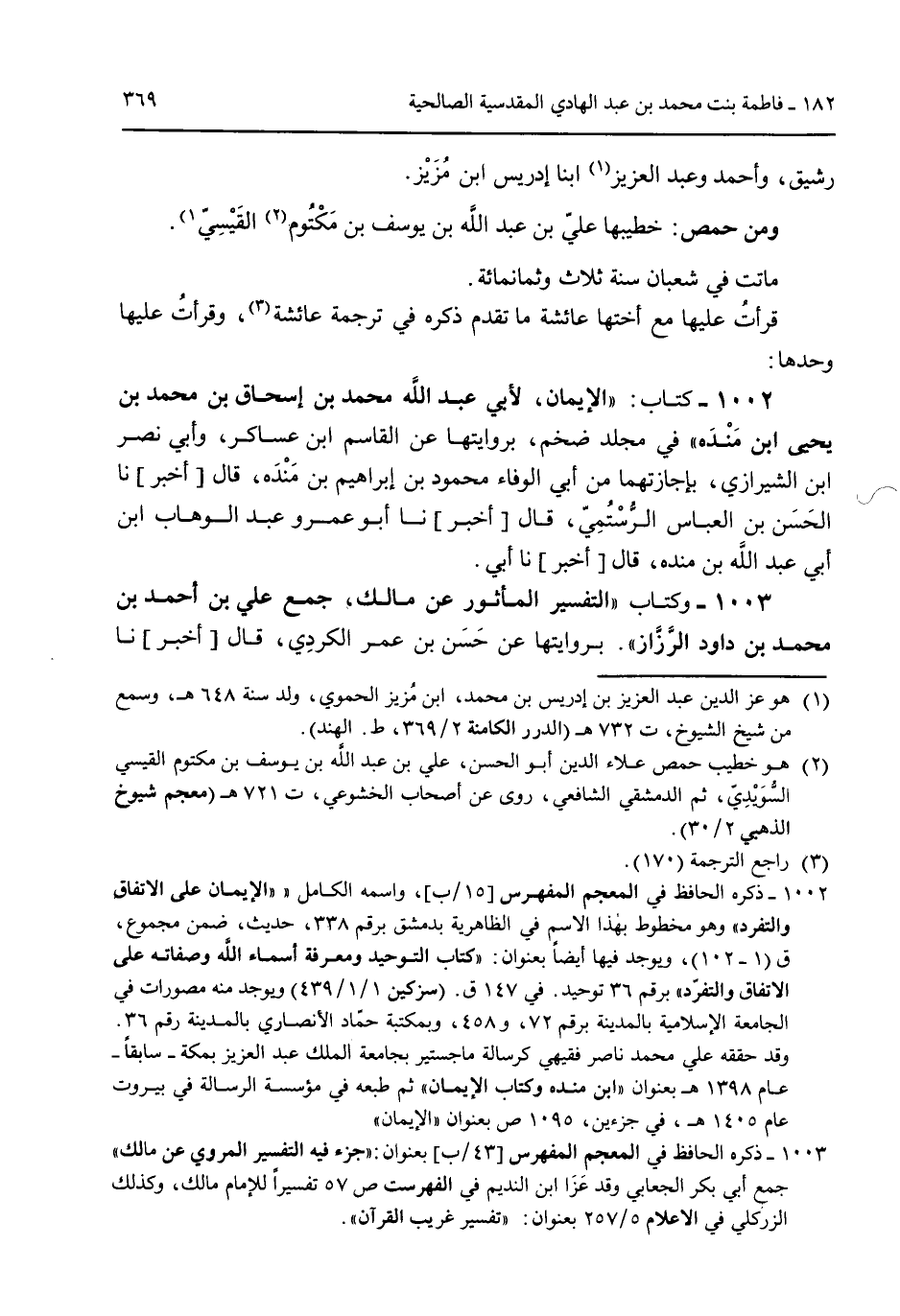 رشيق وأحمد وعبد العزيز ابنا إدريس ابن مُزَيز. ومن حمص: خطيبها علي بن عبد الله بن يوسف بن مكتوم القيسي ماتت في شعبان سنة ثلاث وثمانمائة. قرأت عليها مع أختها عائشة ماتقدم ذكره في ترجمة عائشة وقرأت عليها وحدها: 1002 - كتاب: "الإيمان لأبي عبد الله بن محمد بن إسحاق بن محمد بن يحيى ابن منده" في مجلد ضخم بروايتها عن القاسم بن عساكر وأبي نصر ابن الشيرازي بإجازتهما من أبي الوفاء محمود بن إبراهيم بن منده قال [أخبر] نا الحسن بن العباس الرستمي قال [أخبر] نا أبو عمرو عبد الوهاب ابن أبي عبد الله بن منده قال [أخبر] نا أبي. 1003 - وكتاب "التفسير المأثور عن مالك جمع علي بن أحمد محمد بن داود الرزاز". بروايتها عن حسن بن عمر الكردي قال [أخبر] نا