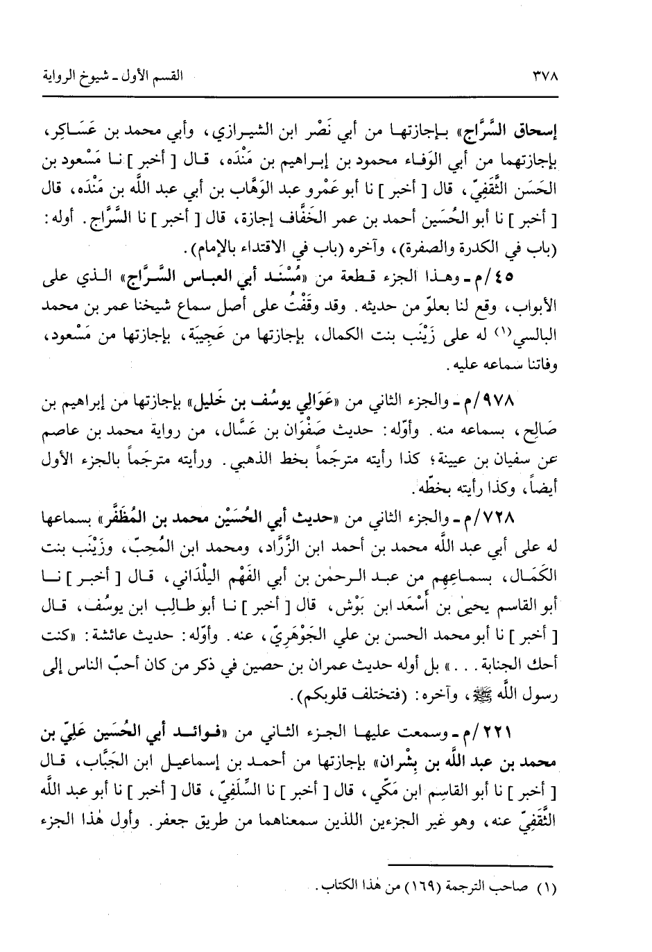 إسحاق السراج" بإجازتها من أبي نصر ابن الشيرازي وأبي محمد بن عساكر بإجازتهما من أبي الوفاء محمود بن إبراهيم بن منده قال [أخبر] نا مسعود بن حسن الثقفي قال [أخبر] نا أبو عمرو عبد الوهاب بن أبي عبد الله بن منده قال [أخبر] نا أبو الحسين أحمد بن عمر الخفاف إجازة قال [أخبر] نا السراج. أوله: (باب في الكدرة والصفرة) وآخره (باب في الاقتداء بالإمام). 45/م- وهذا الجزء قطعة من "مسند أبي العباس السراج" الذب على الأبواب وقع لنا بعلو من حديثه. وقد وقفت على أصل سماع شيخنا عمر بن محمد البالسي له على زينب بنت الكمال بإجازتها من عجيبة بإجازتها من مسعود وفاتنا سماعه عليه. 978/م- والجزء الثاني من "عوالي يوسف بن خليل" بإجازتها من إبراهيم بن صالح بسماعه منه. وأوله: حديث صفوان بن عسال من رواية محمد بن عاصم عن سفيان بن عيينة كذا رأيته مترجماً بخط الذهبي. ورأيته مترجماً بالجزء الأول أيضاً وكذا رأيته بخطه. 728/م- والجزء الثاني من "حديث أبي الحسين محمد بن المظفر" بسماعها له على أبي عبد الله محمد بن أحمد ابن الزراد ومحمد ابن المحب وزينب بنت الكمال بسماعهم من عبد الرحمن بن أبي الفهم اليلداني قال [أخبر] نا أبو القاسم يحيى بن أسعد ابن بوش قال [أخبر] نا أبو طالب ابن يوسف قال [أخبر] نا أبو محمد الحسن بن علي الجوهري عنه. وأوله: حديث عائشة: "كنت احك الجنابة ... " بل أوله حديث عمران بن حصين في ذكر من كان أحب الناس إلى رسول الله صلى الله عليه وسلم وآخره: (فتخلف قلوبكم). 221/م- وسمعت عليها الجزء الثاني من "فوائد أبي الحسين علي بن محمد بن عبد الله بن بشران" بإجازتها من احمد بن إسماعيل ابن الجباب قال [أخبر] نا أبو القاسم ابن مكي قال [أخبر] نا السلفي قال [أخبر] نا أبو عبد الله الثقفي عنه وهو غير الجزءين للذين سمعناهم من طريق جعفر. وأول هذا الجزء